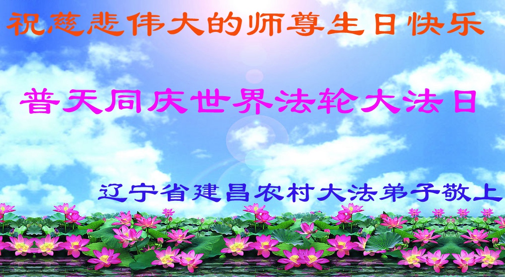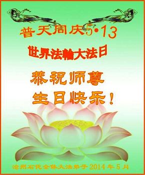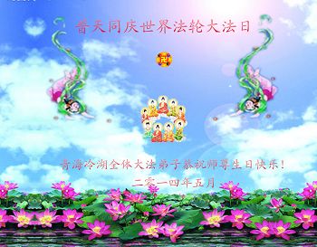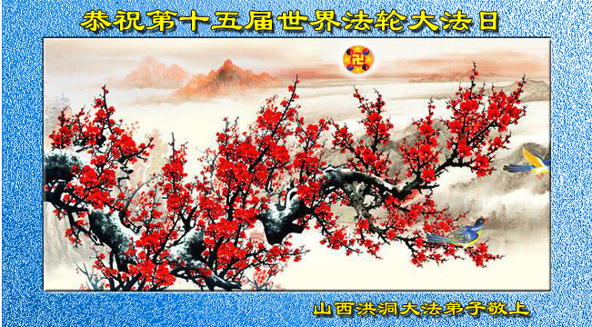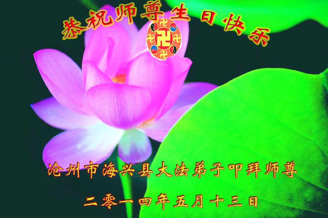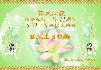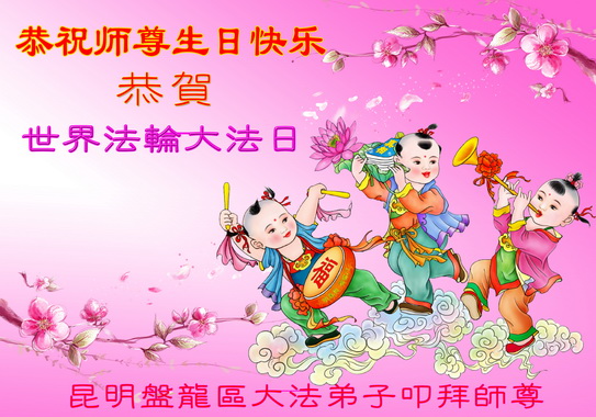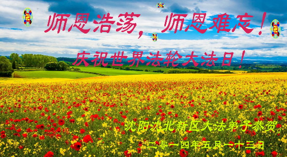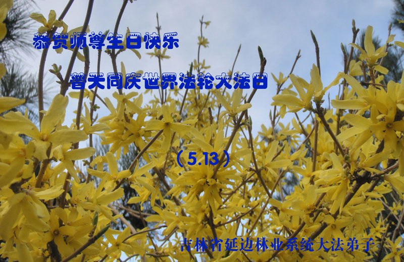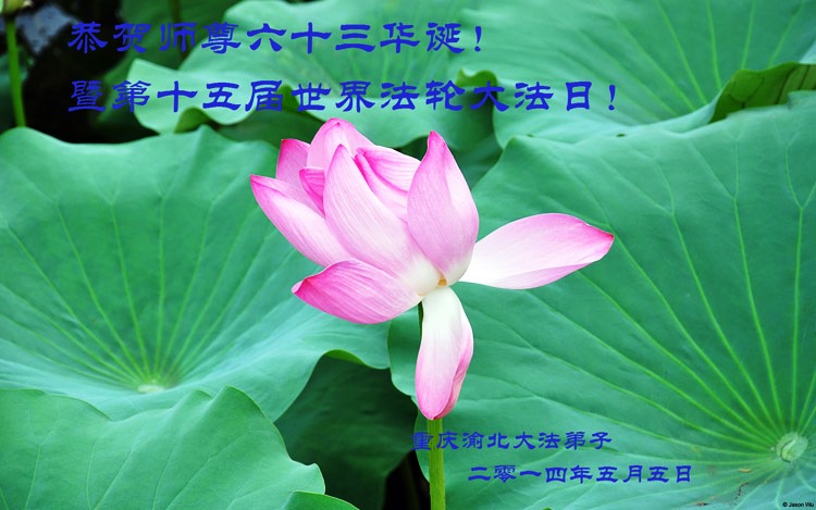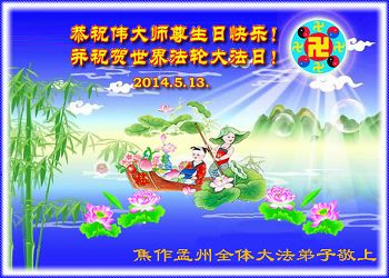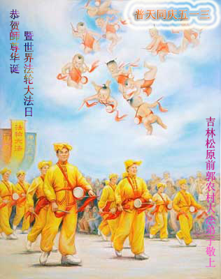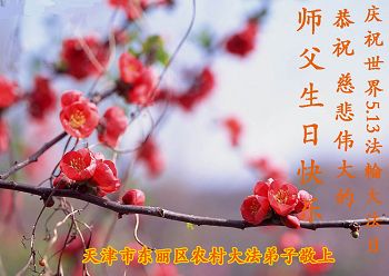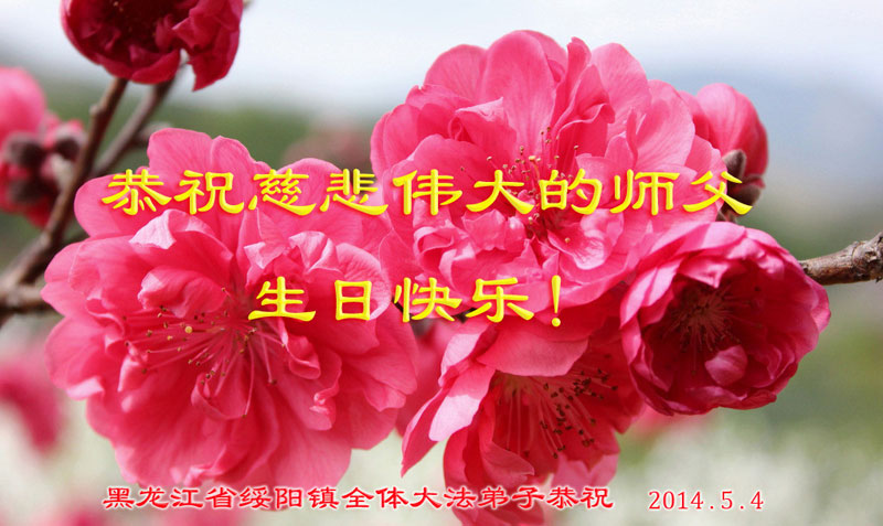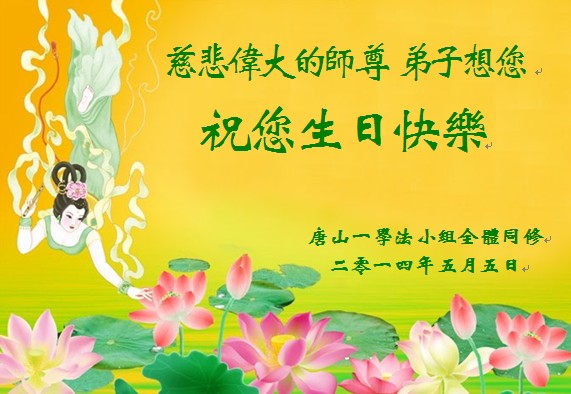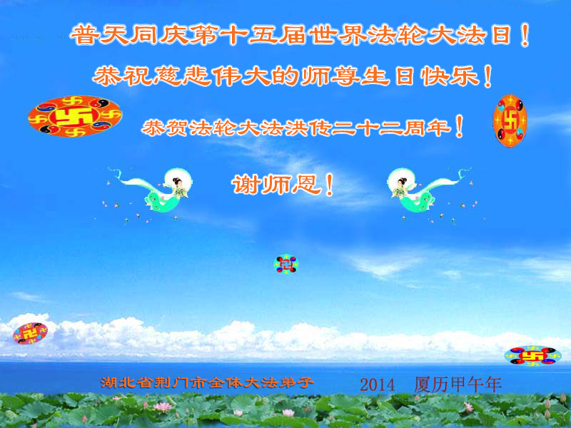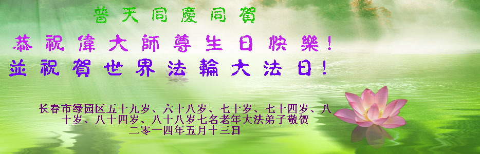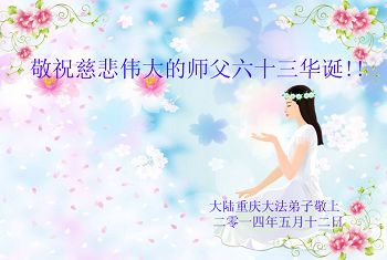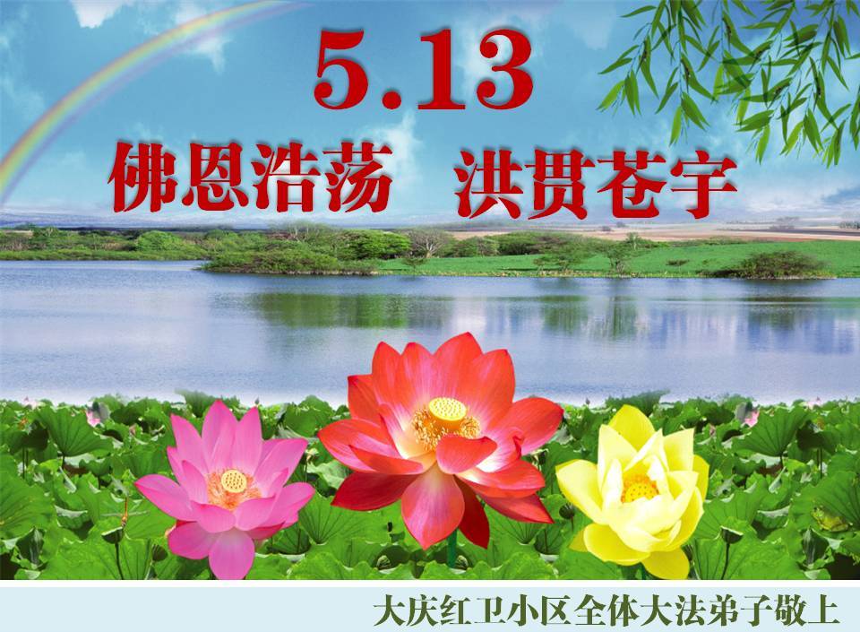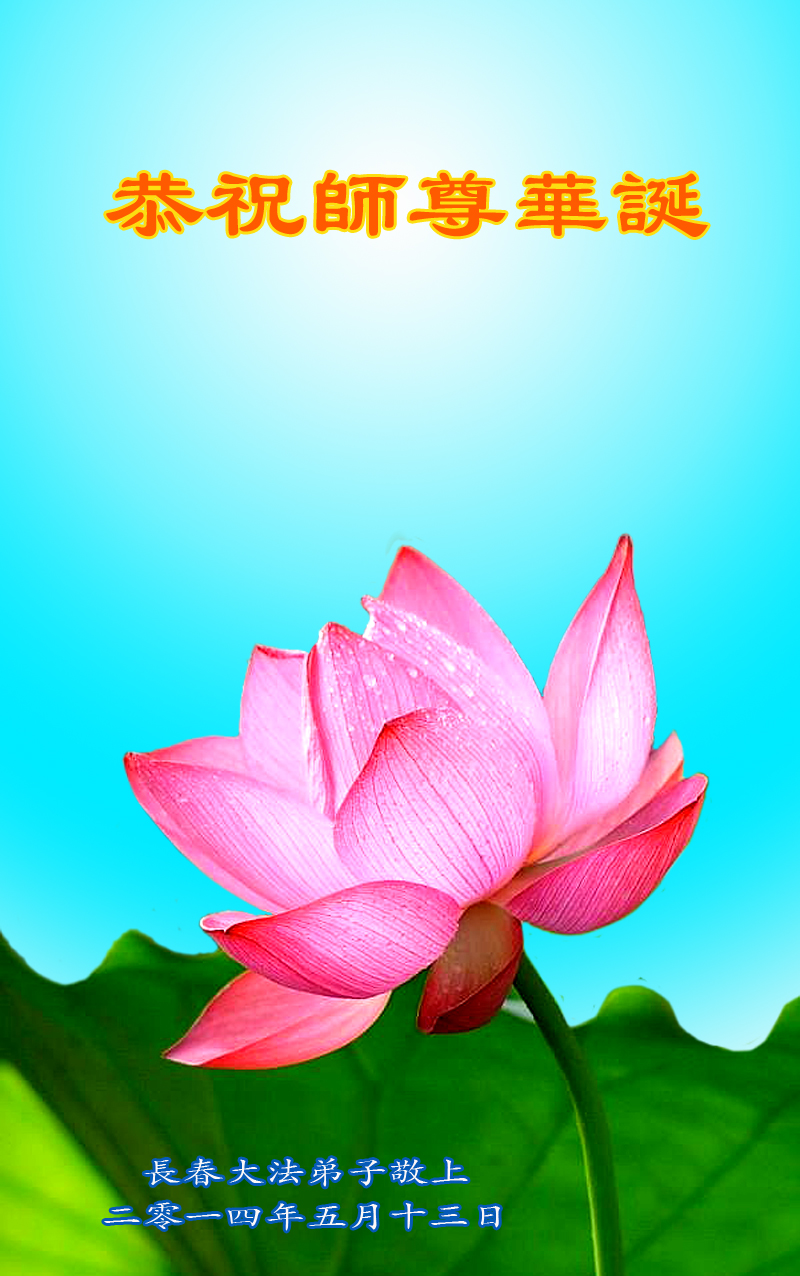 一年过去了,又迎来了新的一年,天上地上普天同庆“五一三”全世界法轮大法日的今天,我们眉山市、县、镇、乡、村全体大法弟子,向慈悲伟大的师父问候,师父您好,师父生日快乐!法轮大法好!真、善、忍好!