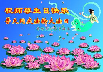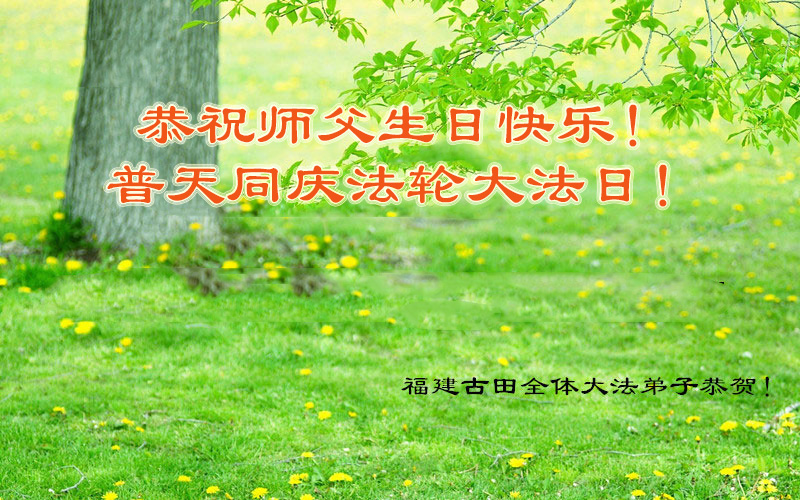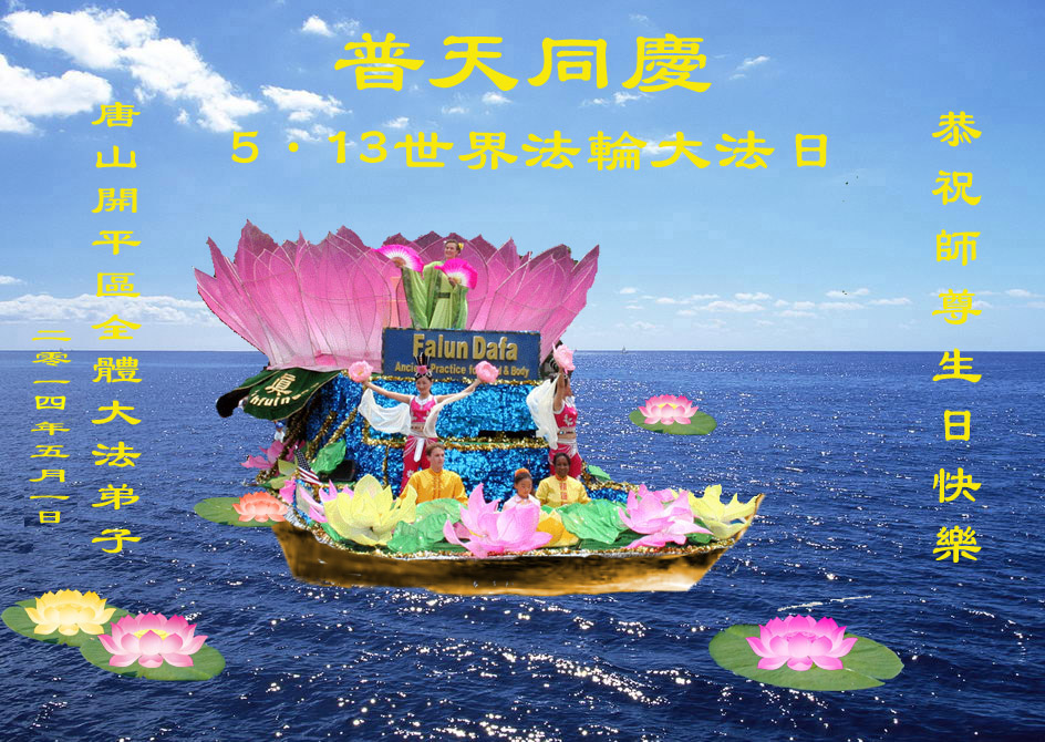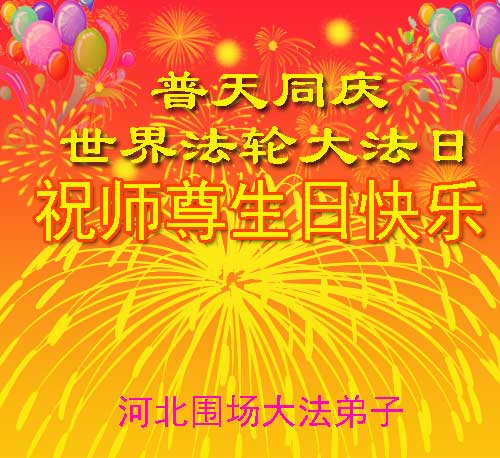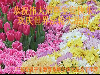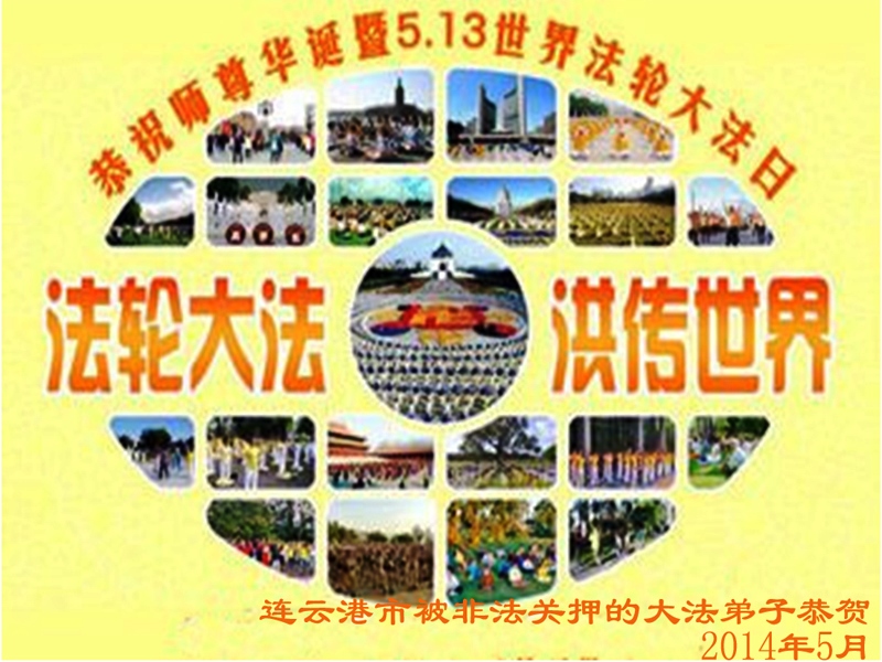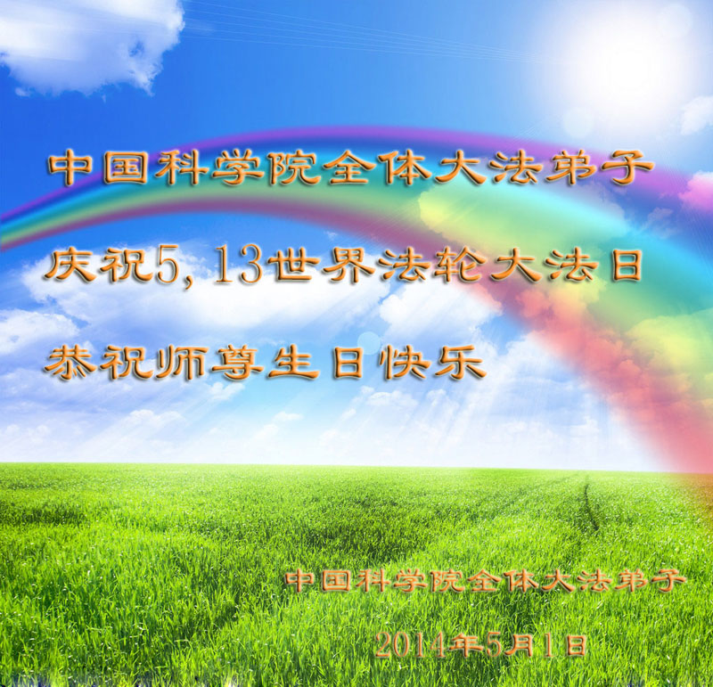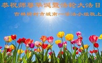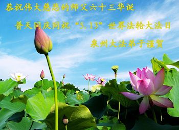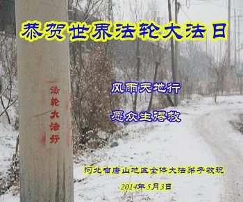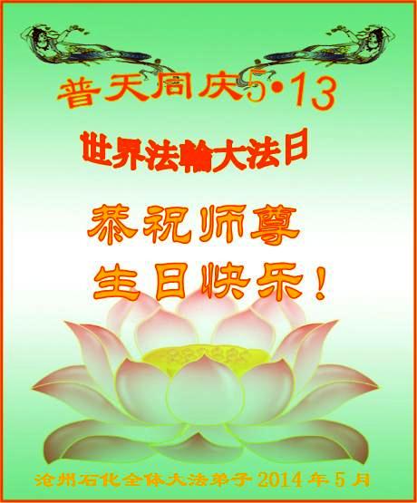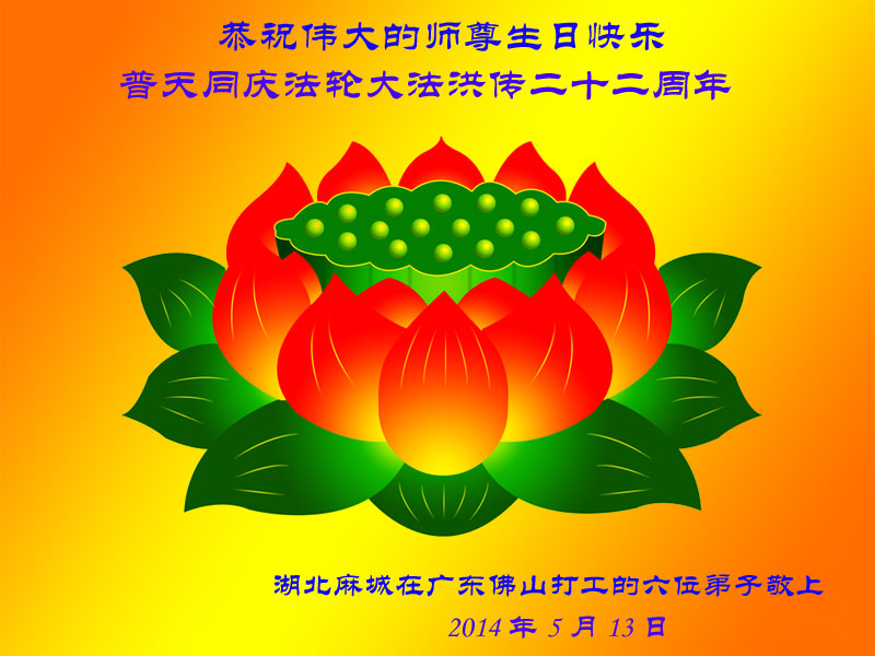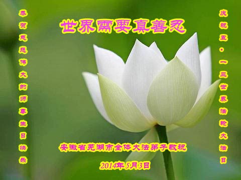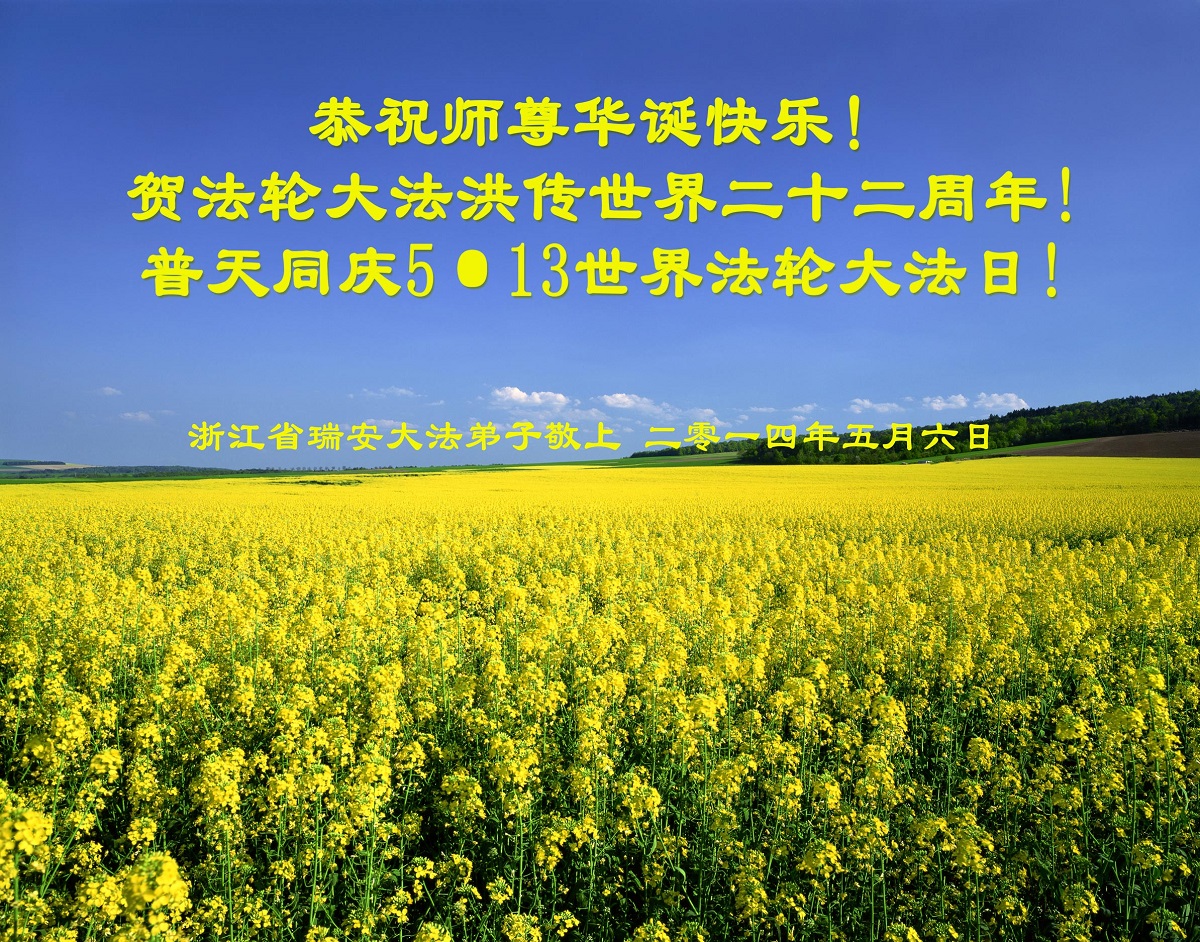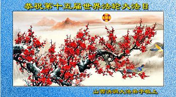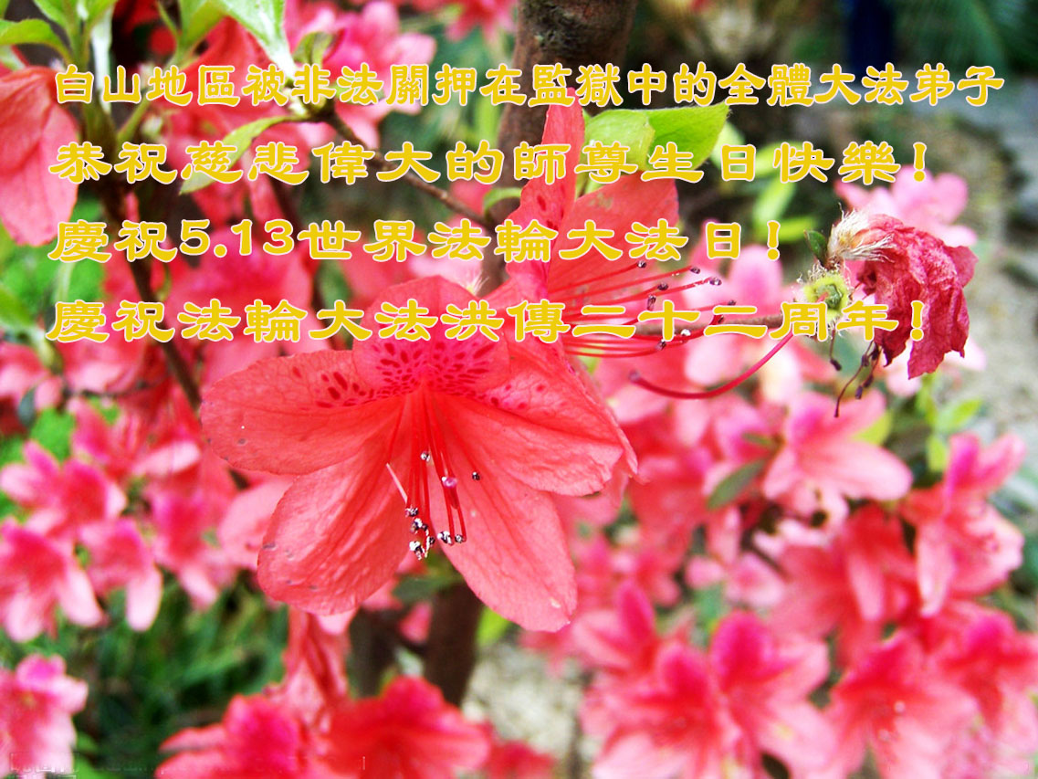 一年过去了,又迎来了新的一年,天上地上普天同庆“五一三”全世界法轮大法日的今天,我们眉山市、县、镇、乡、村全体大法弟子,向慈悲伟大的师父问候,师父您好,师父生日快乐!法轮大法好!真、善、忍好!