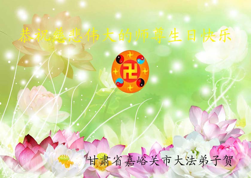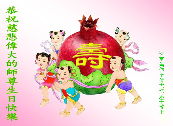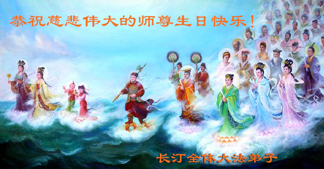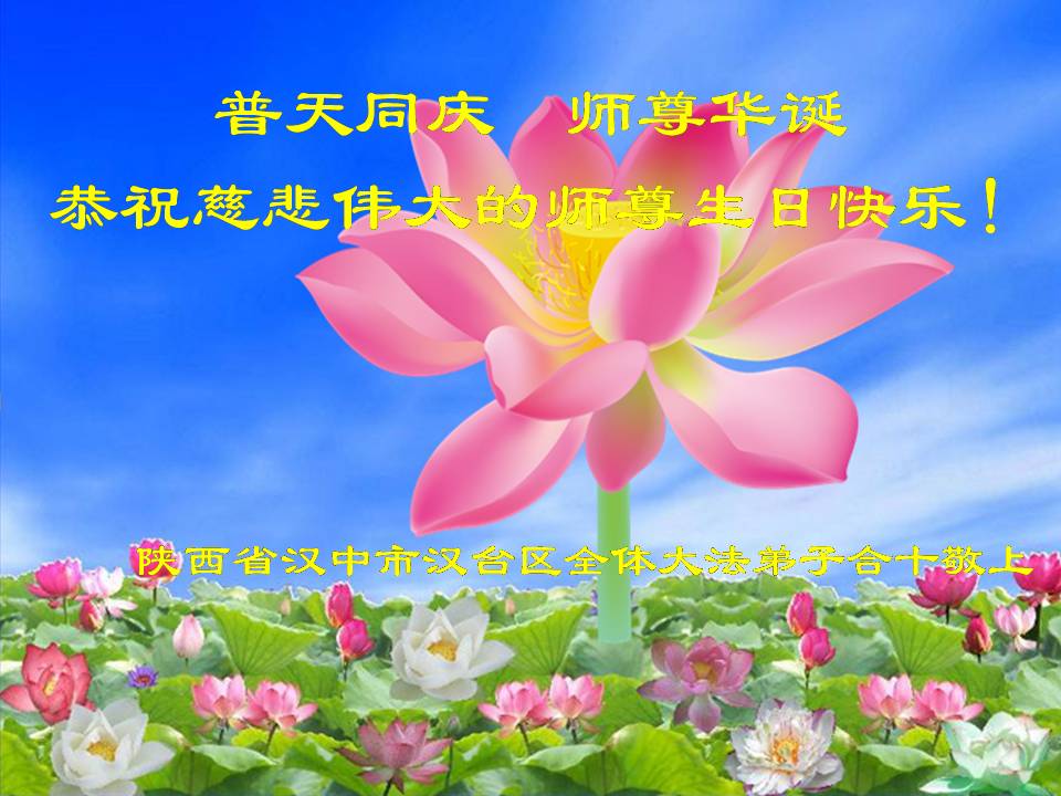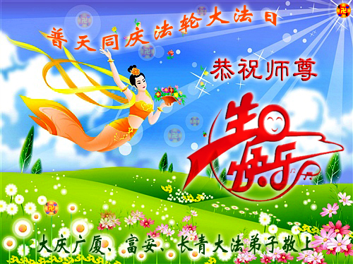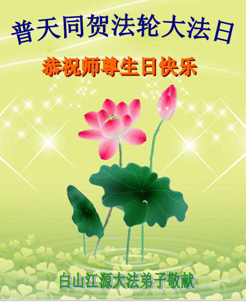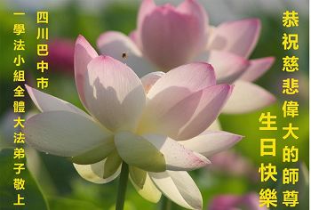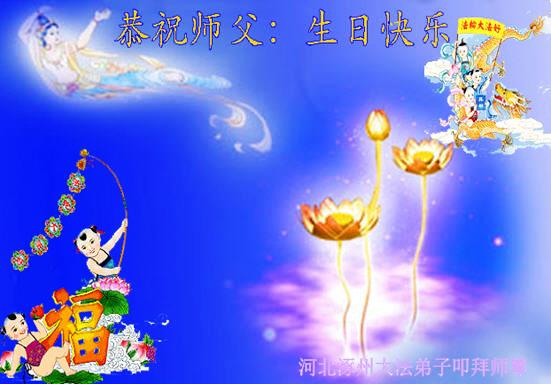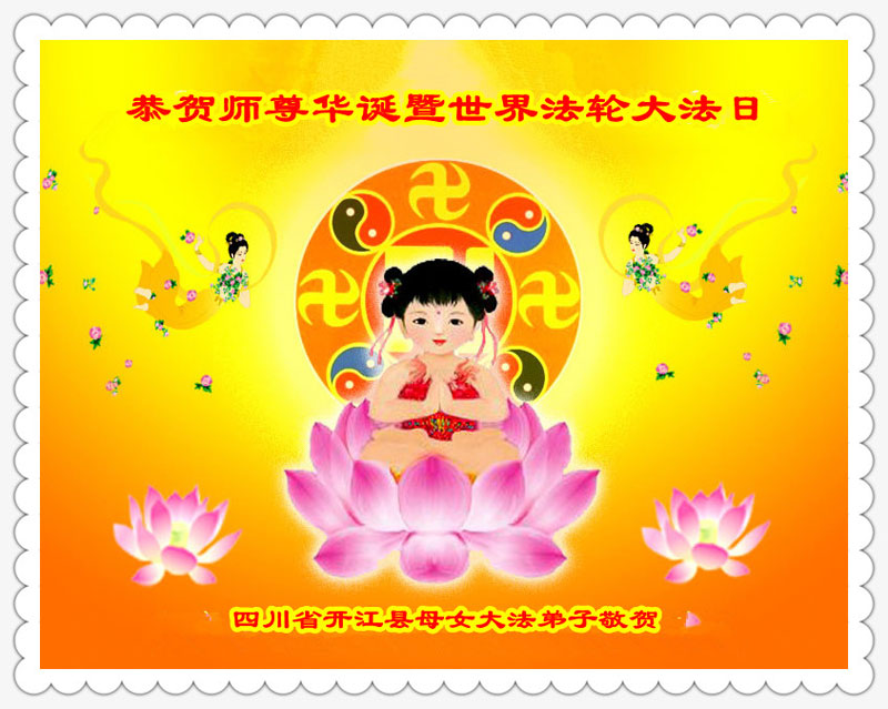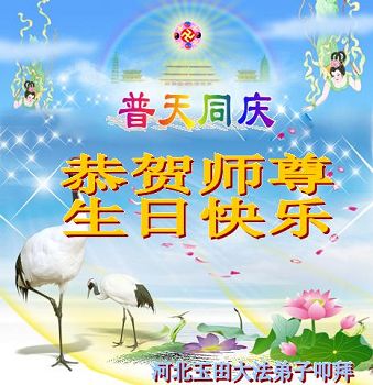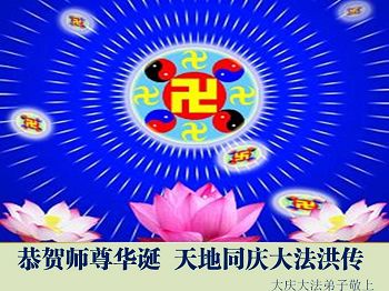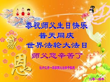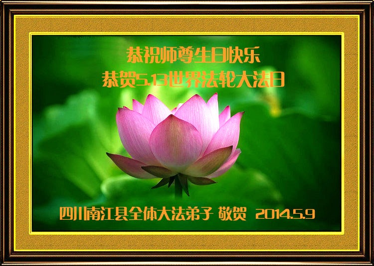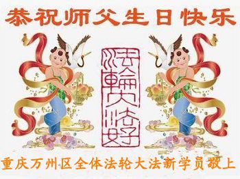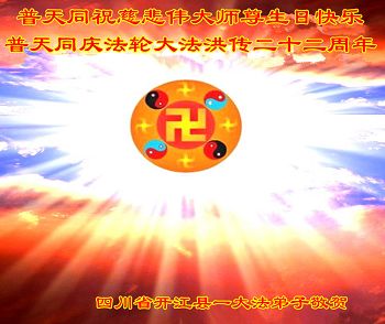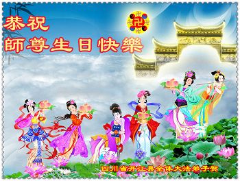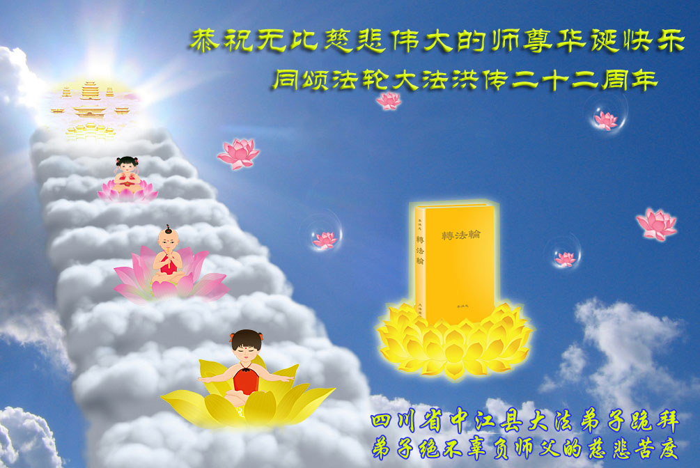 在这普天同庆的大好日子里,四川省中江县全体大法弟子跪拜师尊,祝师尊生日快乐!请师尊放心,我们一定正念正行,走好师尊安排的正法修炼之路,救度更多的众生,兑现自己的史前誓约!