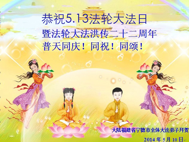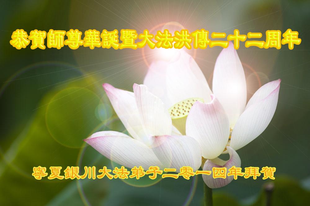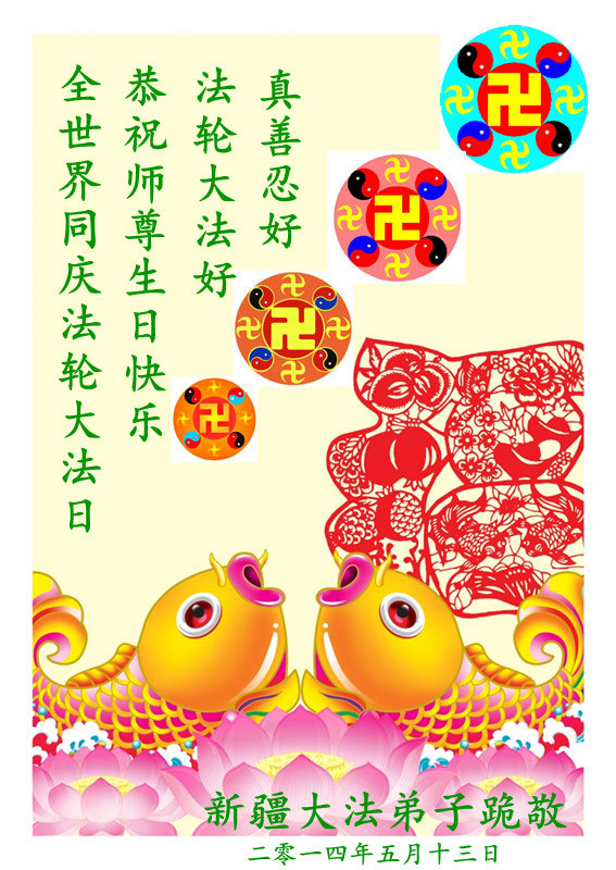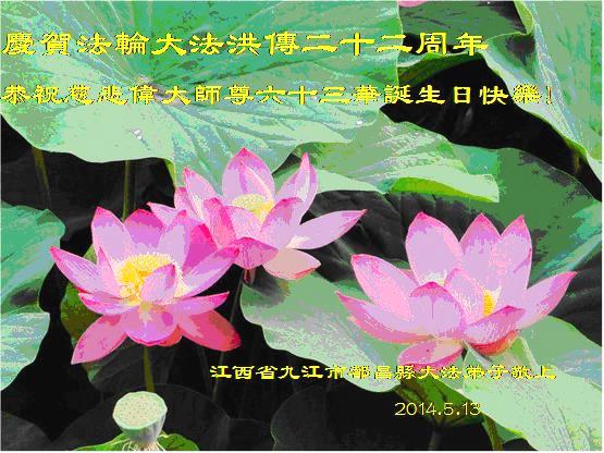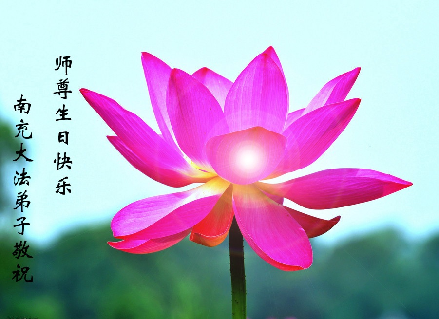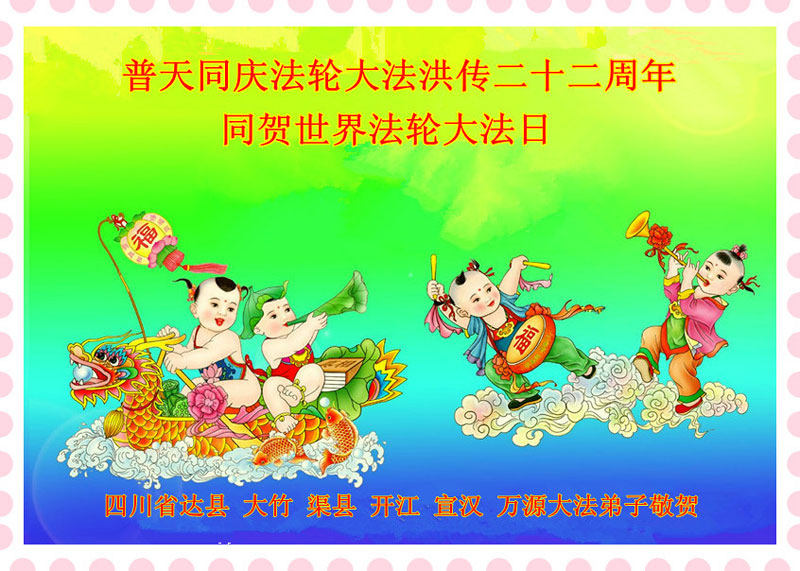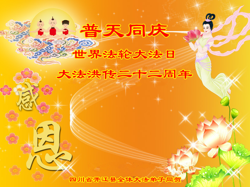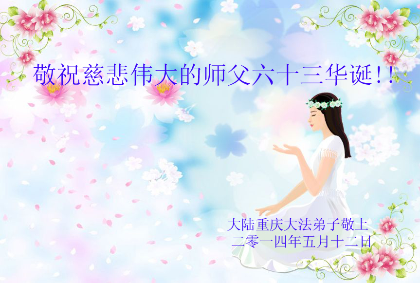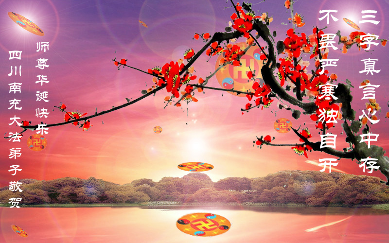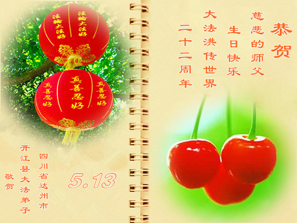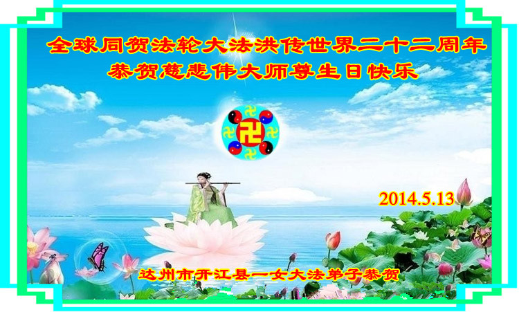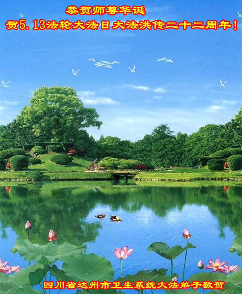 在法轮大法洪传二十二周年之际,我们四川省阆中市全体大法弟子向慈悲伟大的师尊问好,恭祝师尊六十三华诞!与全世界大法弟子与得救的众生感谢师尊的慈悲救度洪恩,共同庆祝5.13-世界法轮大法日。并向师尊合十叩拜!