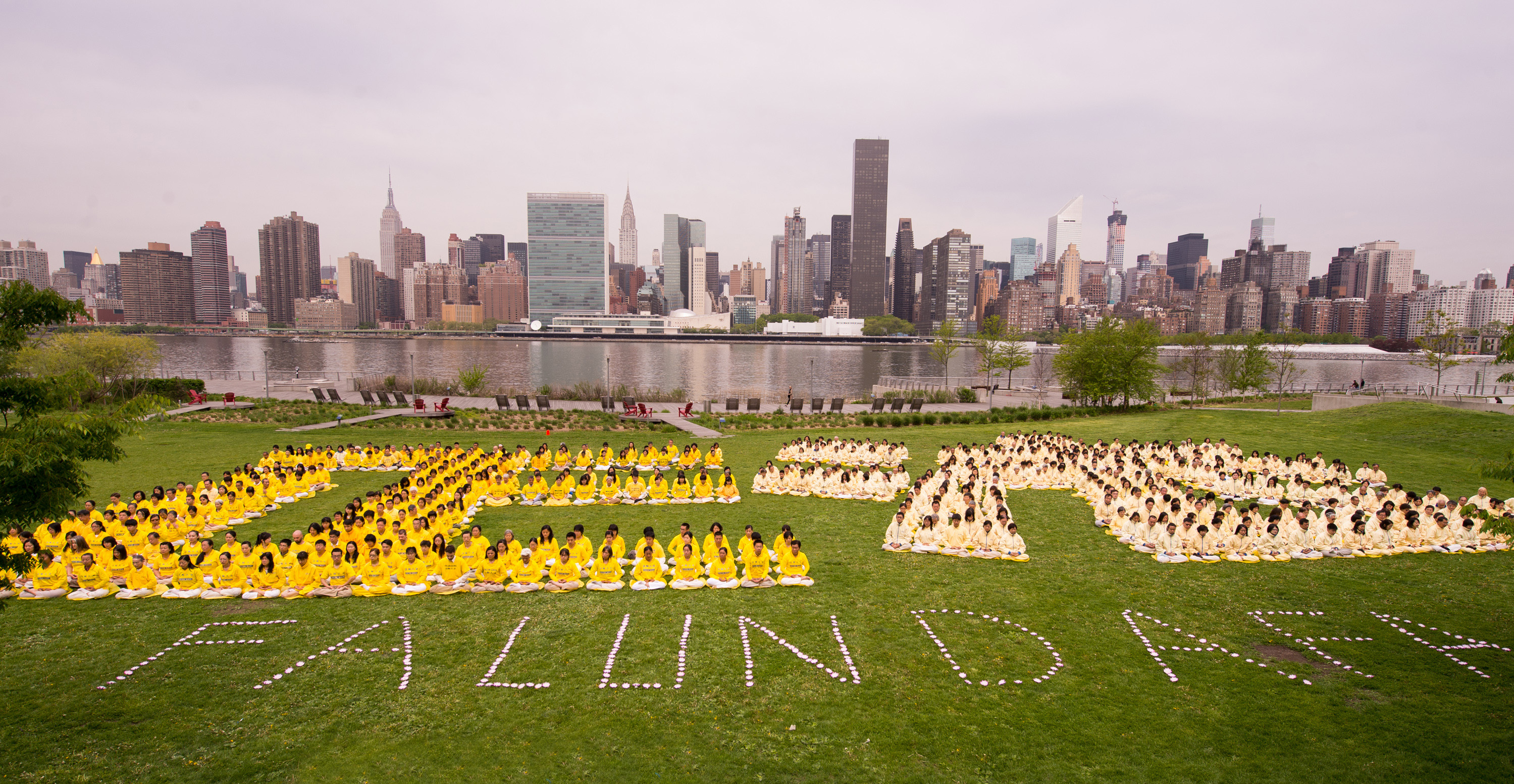 ![]() 法轮功学员在纽约甘醇(Gantry Park)公园以排字炼功,展现光明美好。 |