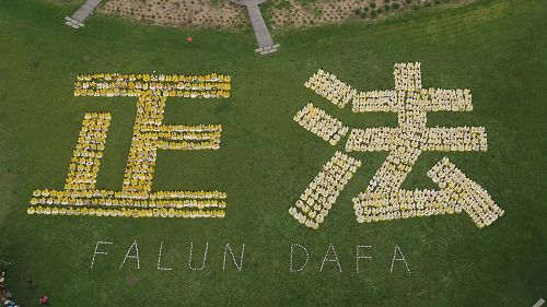 十四日的上午,八百多名法轮功学员依序而坐,“正法”两个大字很快地展现出来。碧绿的草坪,金色的大字,场面祥和庄严,受到当地居民的赞赏。