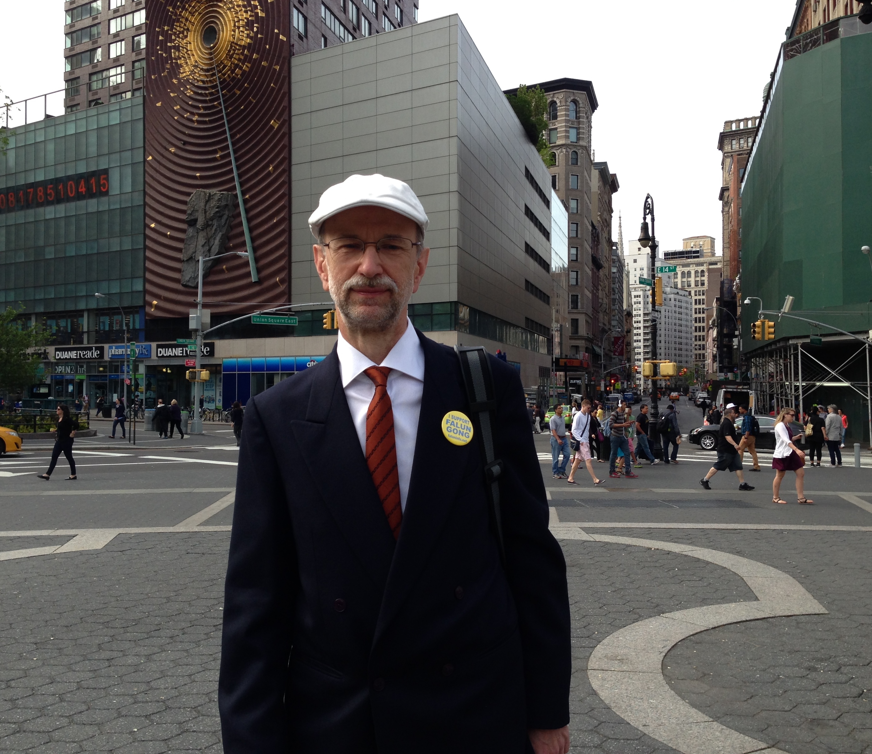 从事艺术史研究和艺术创作的雅斯•默迪卡(Jas' Motyka)先生来自波兰,他修炼法轮功七年了,这是他第四次参加纽约国际法轮大法修炼心得交流会。五月十三日清晨,雅斯来到纽约联合广场参加大炼功,炼功结束后,他匆匆吃过随身携带的面包就赶着去参加法会。他表示,“法轮大法日”是个特殊的日子,在这一天来自世界各地的很多大法弟子汇聚在纽约有重大意义,能够让更多的人尽快了解法轮功真相,因为时间很紧迫。他说:“师父做的一切是为了我们大法弟子,也是为了那些该被救的世人。”“今天我们在(联合广场)这里集体炼功,能够让更多人看到法轮功,希望更多的人能够了解法轮功在中国无辜被迫害的真相,早日结束迫害。”