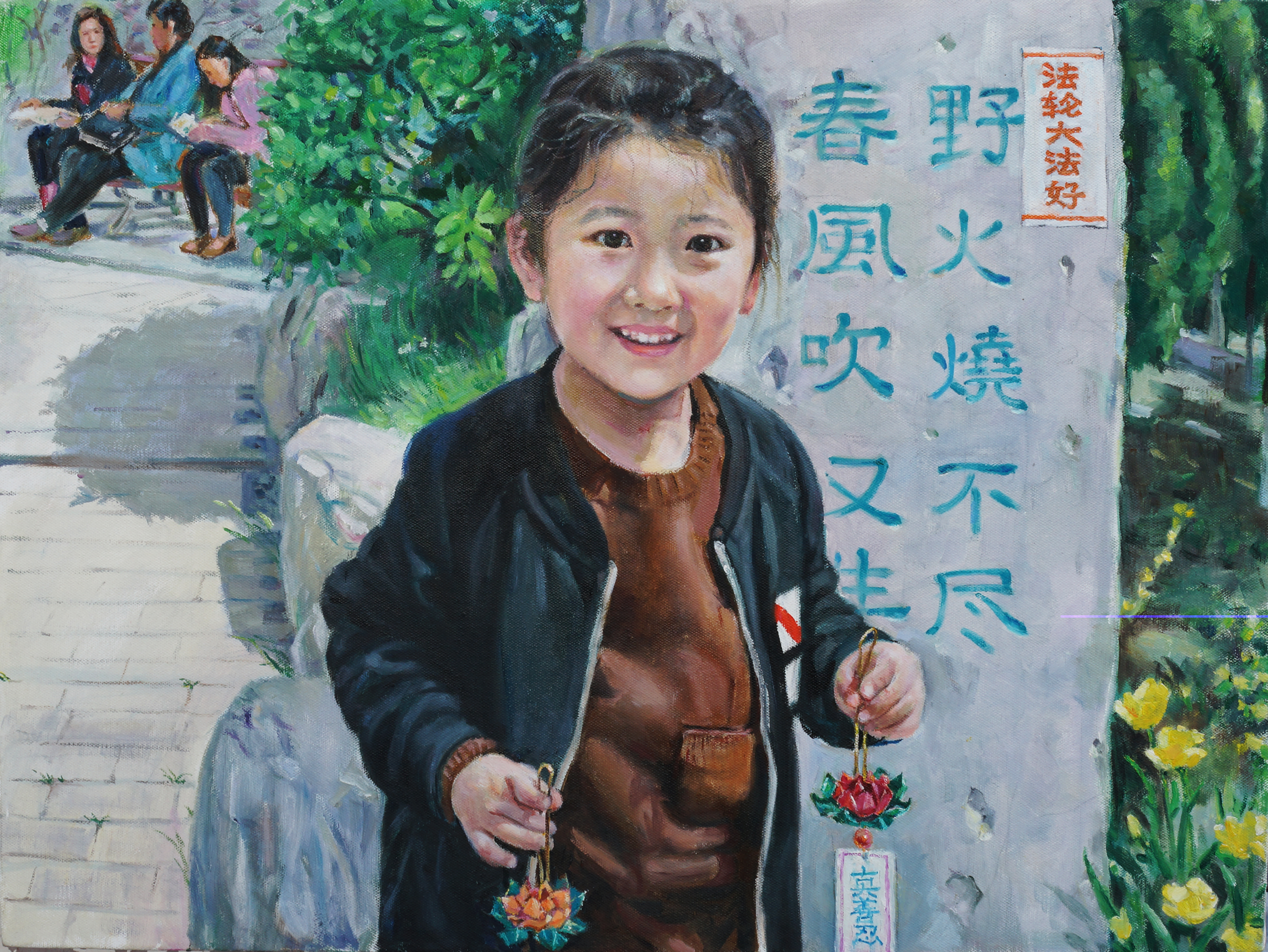 某公园一角,奶奶坐在长椅上给人讲真相,孙女高兴地给行人送生命的护身符,说:有缘人快来拿。