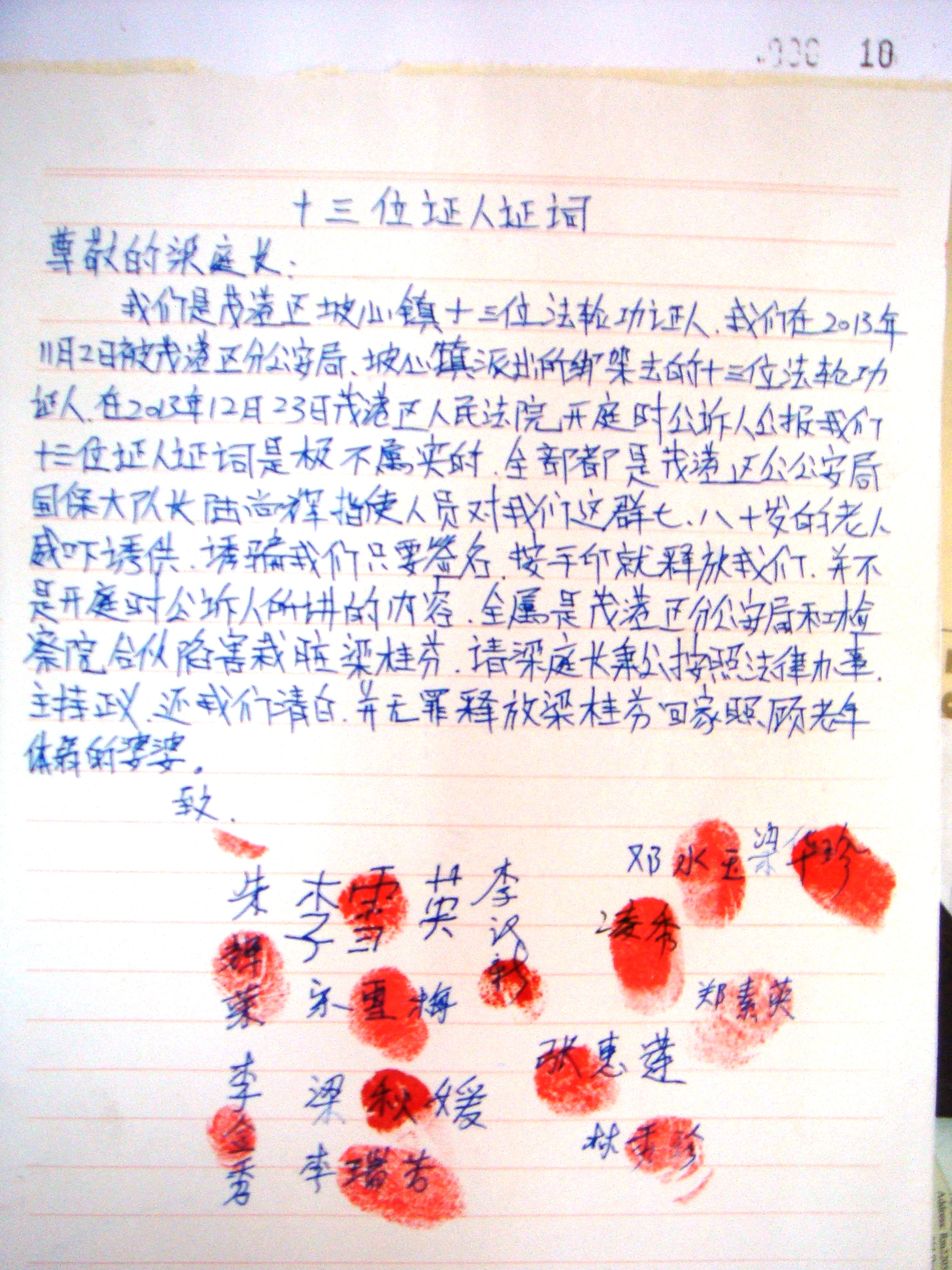 我们是茂港区坡心镇十三位法轮功证人。我们是在2013年11月2日被茂港区公安分局坡心镇派出所绑架去的十三位法轮功证人。在2013年12月23日茂港区法院开庭时,公诉人公报我们十三位证人证词极不属实的,全部都是茂港区公安分局国保大队长陆尚辉指使人员对我们这群七、八十岁的老人威吓诱供,诱骗我们只要签字、按手印就释放我们,并不是开庭对公诉人所讲的内容,全属是茂港区公安分局和检察院合伙栽赃梁桂芬。请梁庭长秉公按照法律办事、主持正义,还我们清白,并无罪释放梁桂芬回家照顾老年体弱的婆婆。