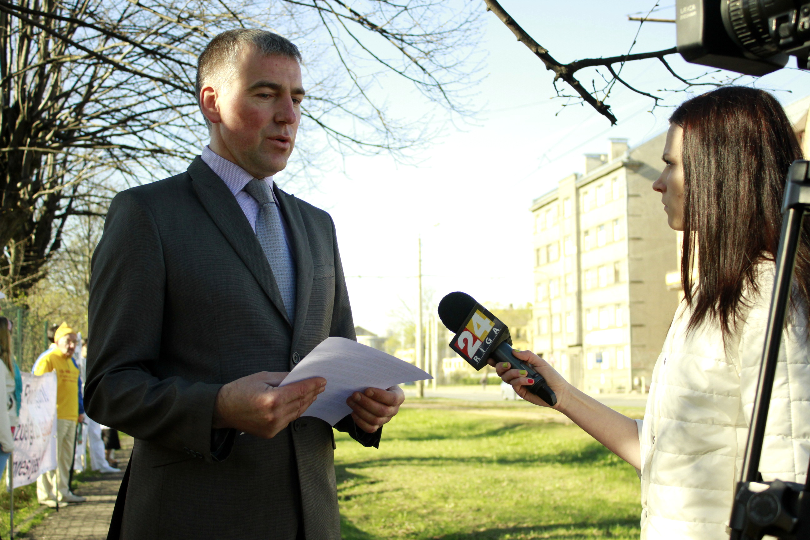 ![]() 里加电视台记者采访参加抗议的法轮功学员 |