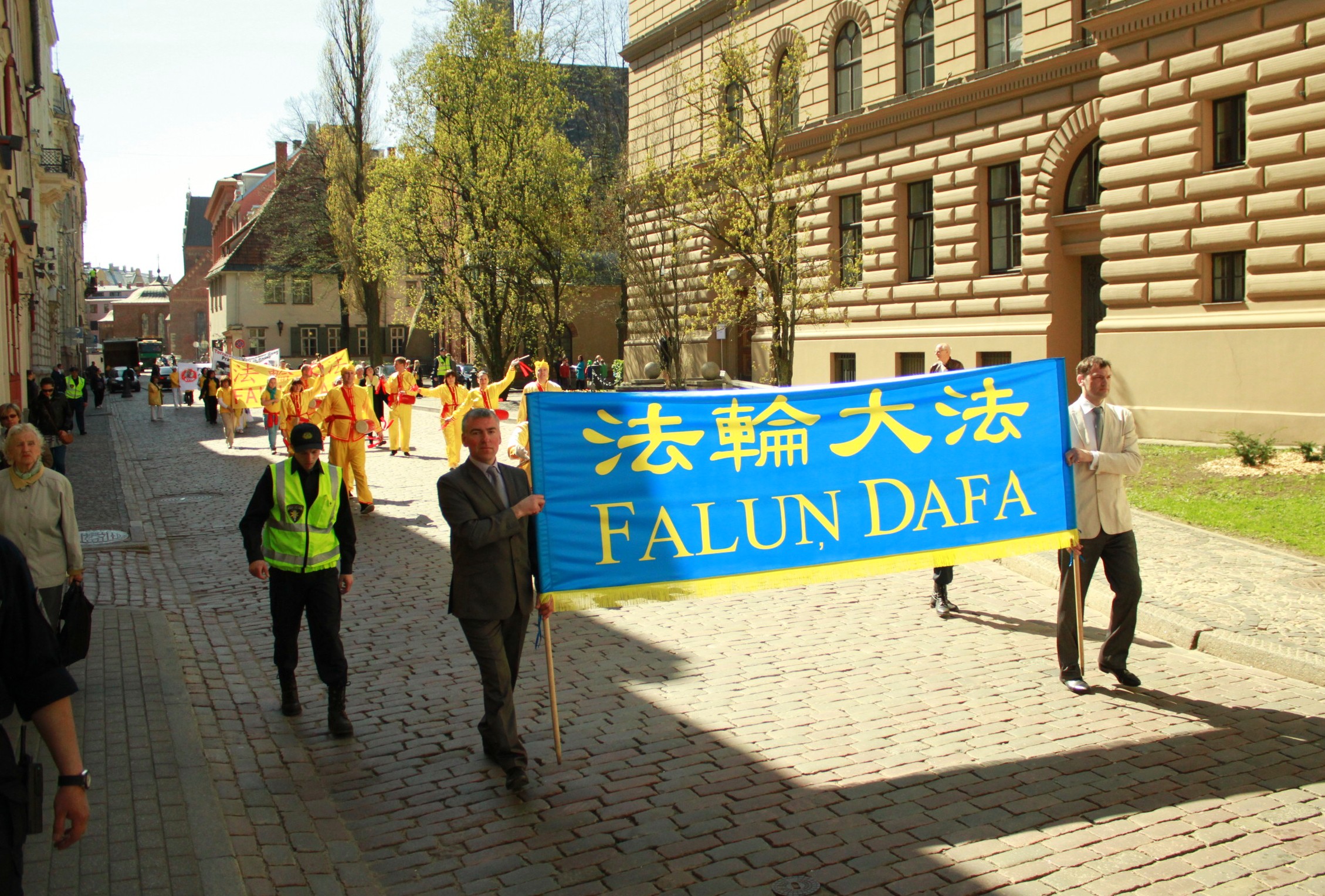 ![]() 法轮功学员的游行队伍经过拉脱维亚政府大楼 |