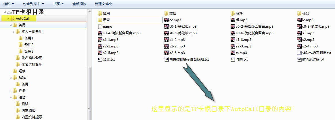 1、确保计算机中安装有winrar.下载程序配套的三:退.辅助包,共12个压缩文件,放在同一个目录下,例如“D:\下载”这个目录。然后,右键点击其中任何一个文件,选择“解压到当前文件夹”,解压后得到autocall目录。注意,常见错误是选错菜单,导致autocall目录下只有一个子目录,名字也是autocall.正确的情况是autocall目录中有一系列文件和多个子目录,可参考下面的“各文件与文件夹在TF卡中的分布结构样图”。