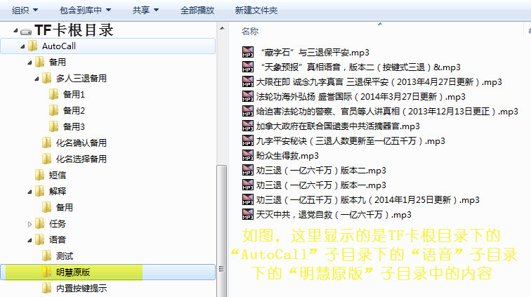 (2)使用子目录的好处,除了整齐归类,还可以限定目录播放的范围。例如,可在“AutoCall\语音\”下建立多个新的子目录来存放不同类别的真相语音文件,这样在使用软件的目录播放功能时,软件不会跨越子目录来播放。但是,使用子目录容易使新手找不到需要的真相语音,或者难以切换存放在不同子目录中的真相语音。所以,对于新手,建议所有语音都放在“AutoCall\语音\”下,包括原本在“内置提示”子目录中的语音,也可以移动到“AutoCall\语音\”下。“AutoCall\任务\”这个目录的使用方法也类似,不同的是放置的是目标号码文件。