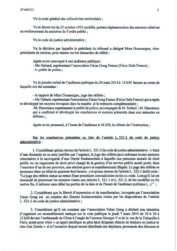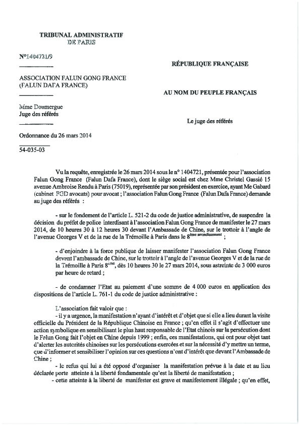 1. 考虑到法轮功协会声明于3月27日周四10点半到12点半在中(共 - 译注)国使馆对面、在巴黎乔治五世大街与La Trémoille街交接处公众地段上举行的集会,“以和平方式要求中国最高领导人法办江泽民团伙”,并散发有关传单、通过话筒和高音喇叭发表演说、播放音乐等一事属实;考虑到警察局2014年3月25日做出的、次日发给法国法轮功协会的命令,拒绝其在所计划的日期与时间,在乔治五世大街与La Trémoille街交接处、包括这两条街上的集会的权利;事情的紧急性得以确立;