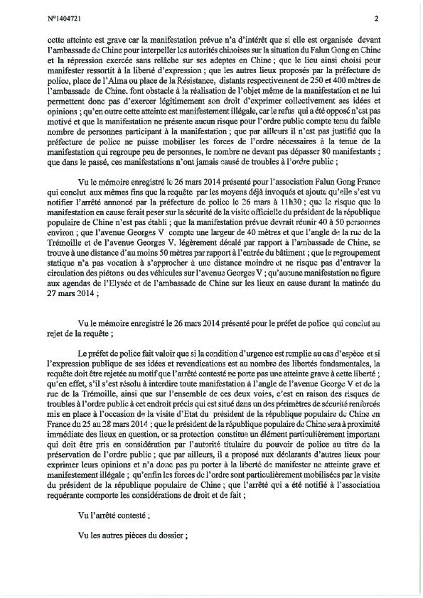 鉴于记录于2014年3月26日的法国法轮功协会提交的文件包含与协会上述请求同样的内容,而且它于3月26日11点30分,被警察局通知禁止集会;鉴于该集会会对中华人民共和国主席的正式访问的安全带来风险的假设没有根据;鉴于该集会大概会有4、50人;鉴于乔治五世大街有40米宽,且其与La Trémoille街的交接处与中国使馆稍微错开,所以集会地点与(使馆- 译注)建筑物入口有至少50米的距离;鉴于集会是静止的,不会更近,不会阻碍乔治五世大街上的行人和车辆的往来;鉴于没有任何有关爱丽舍宫(法国总统府 - 译注)和中(共 - 译注)国使馆在3月27日上午在有关地点活动安排的记录;