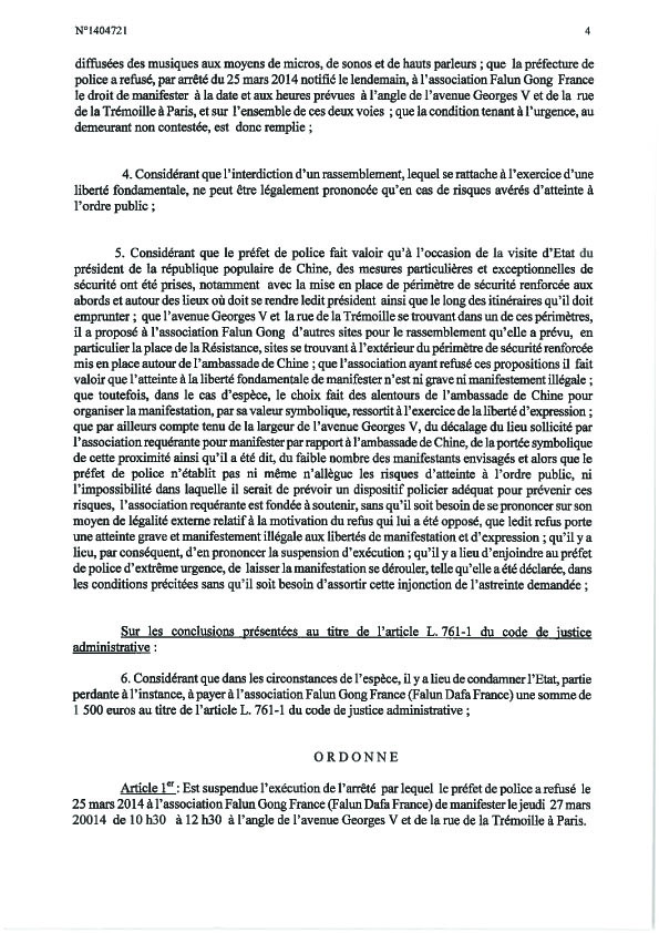 警察局长陈述说,如果说此事的紧急性成立,而且公共表达理念和诉求属于基本自由的话,(法国法轮功协会的 - 译注)集会请求应予拒绝,原因是被(法国法轮功协会 – 译注)抗议的拒绝令并没有对上述自由构成严重侵犯;事实上,所有在乔治五世大街与La Trémoille街交接处人行道上、及这两条街上的集会一概遭到禁止,原因是这一具体地点的公共秩序风险问题,因为这一地点属于在2014年3月25日到28日之间中华人民共和国主席对法国的国是访问期间安全措施有所加强的地段之一;中华人民共和国主席会很接近这些地段,而对他的保护应以维护公共秩序的名义得到警方权力当局的重视而成为特别重要的事情;另外,它(警方- 译注)向申请集会方建议了其它的地点以表达他们的观点,所以并没有严重侵犯集会自由和明显非法的事;最后,警力因中华人民共和国主席的到访而特别动员;向申请协会发出的禁令同时考虑到了权利与实际情况;