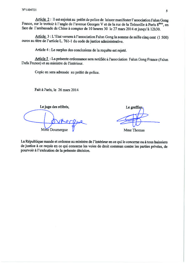 ⁃命令警方允许法国法轮功协会3月27日10点半开始在中(共 - 译注)国使馆前、巴黎第八区乔治五世大街与La Tremoille街交接处人行道上的集会,每拖延1小时(警方 - 译注)将受到3000欧元的罚款;