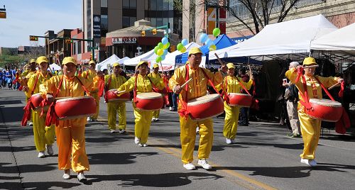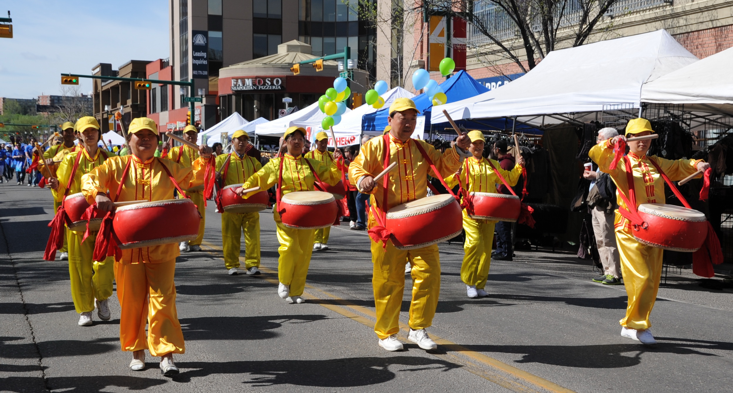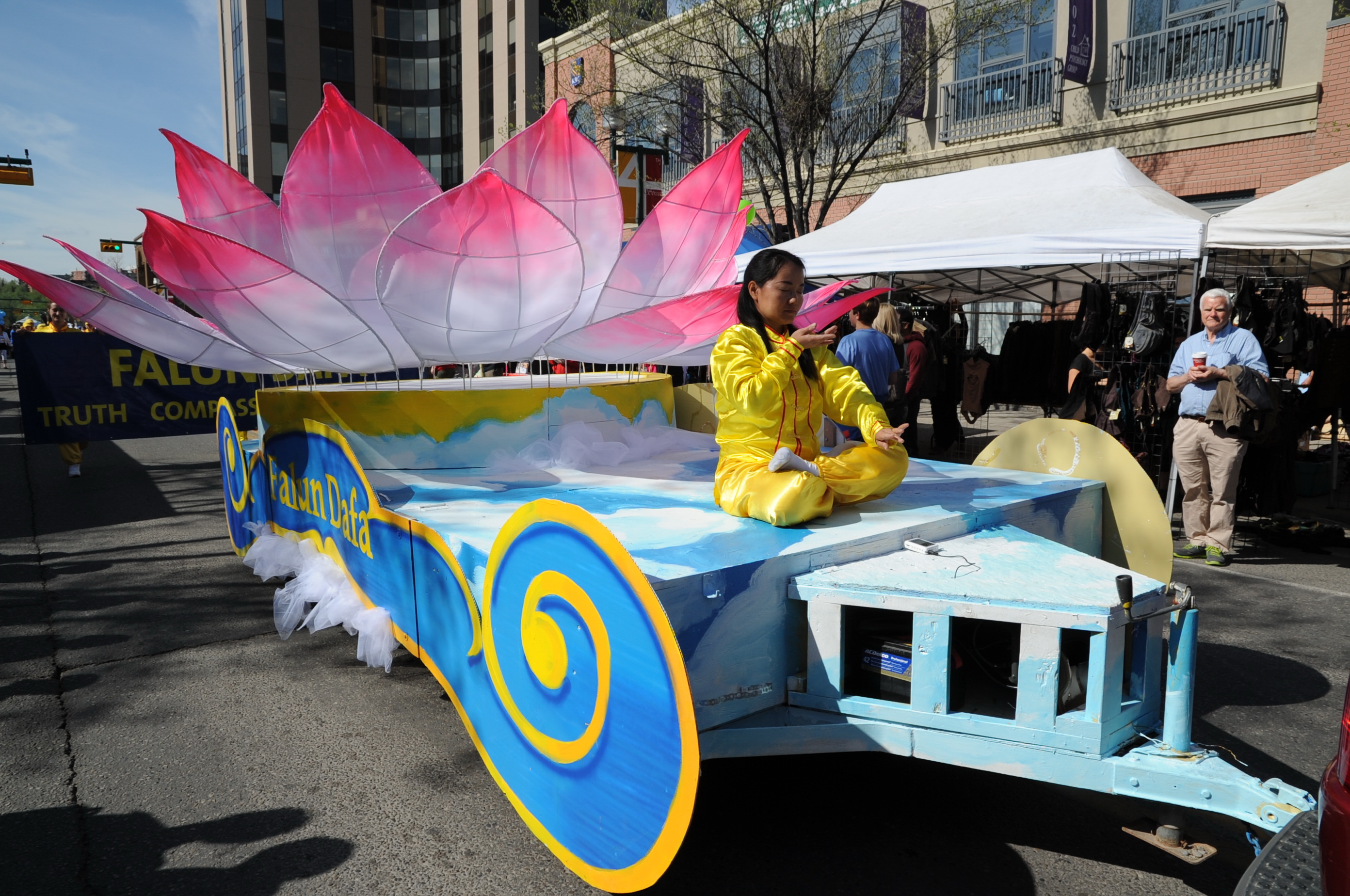 在开幕式游行的队伍中,法轮大法的游行队伍以鲜艳的色彩、令人振奋的鼓点和充满朝气的风貌,赢得了观众的掌声、赞誉和欣喜的笑容。许多西人读着横幅和花车上的字:“法轮大法”。有的华人观众自豪地对身边的人说:“卡城最漂亮的华人游行队伍就数法轮功了,好给中国人争面子!”