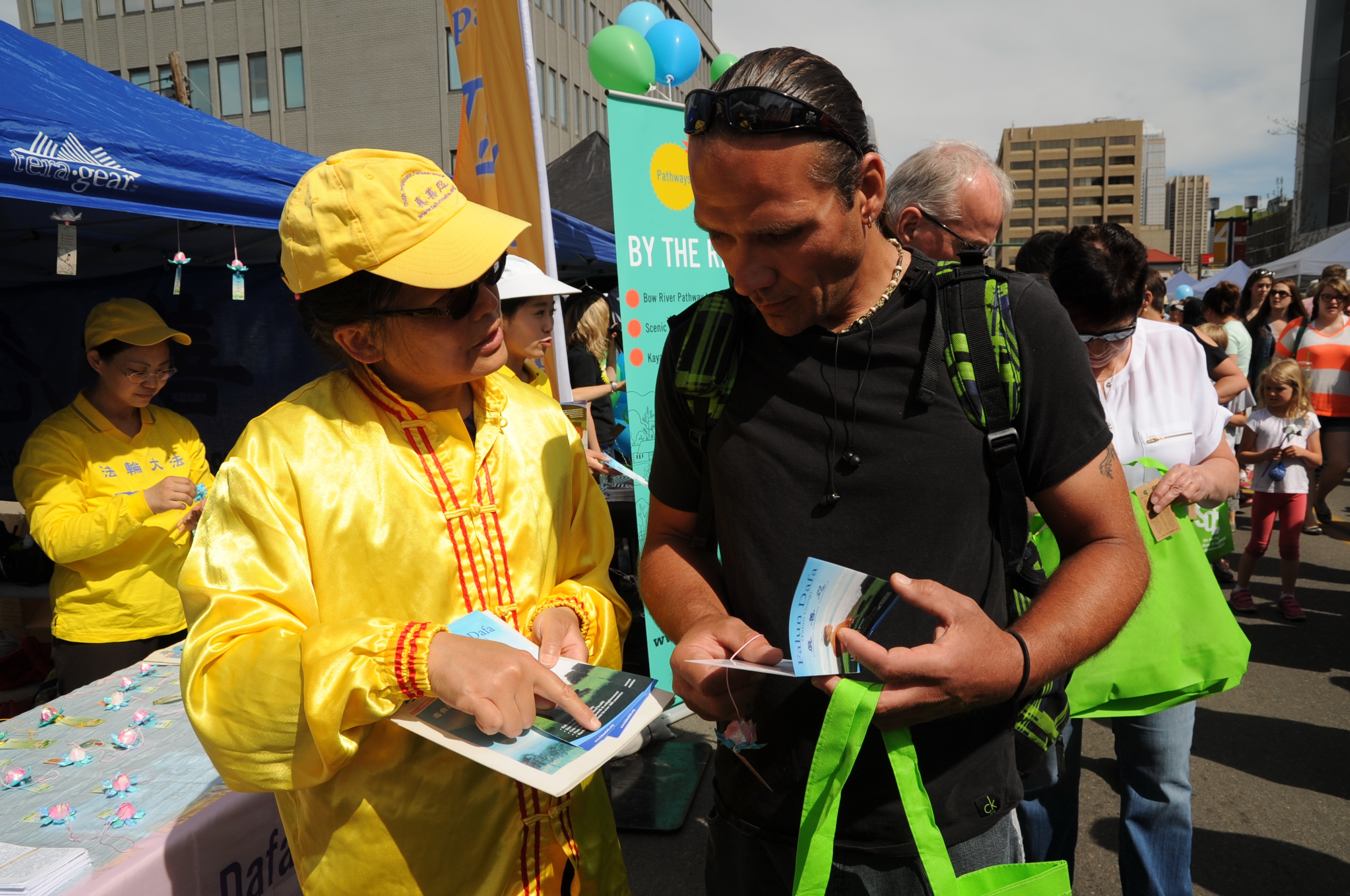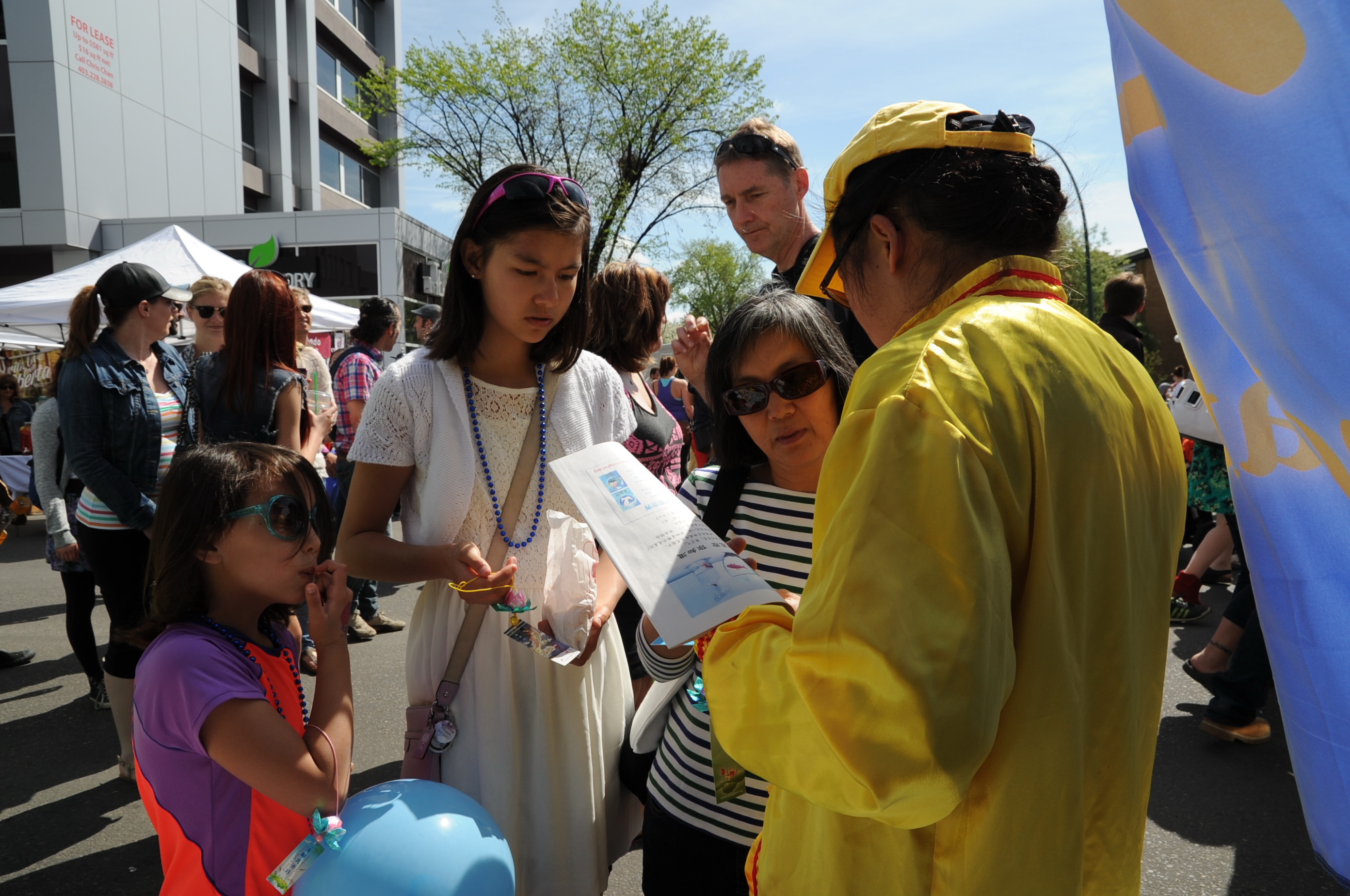 一对年轻的白人驻足在展台前良久,其中的女士表情沉重地询问大法学员:“黄金陵女士的女儿从中国监狱被放出来了吗?”黄金陵女士是卡城居民,她女儿陈英华因修炼法轮功至今被石家庄看守所非法关押。这位年轻女士是从当地的新闻中获悉此事的。当听说陈英华还被关着,至今不允许任何人会见时,她很难过,说自己从听到这个消息就开始每天为陈英华祈祷,希望她平安,并尽快获得自由。她问:“这是为什么?她为什么受到这样的对待?”还没等学员回答,她身边的男士就用轻蔑的口气说:“因为那是共产党!共产党就是会用权力对付那些它认为的想象敌人,即使那些人对它没有任何威胁。”