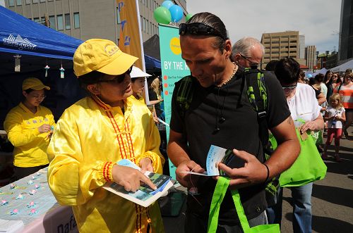一位褐发老年白人女士紧紧握着一张介绍大法的传单,指着封面上法轮大法的网址高兴地说:“这里可以看到所有学法炼功的内容,我也可以在家自学法轮功了!”她介绍说,去年七月初本市的牛仔节,她看到一个队伍非常非常漂亮,她就记住了,那叫法轮功,她一直很想知道有关法轮功的更多内容,今天可算如愿了。