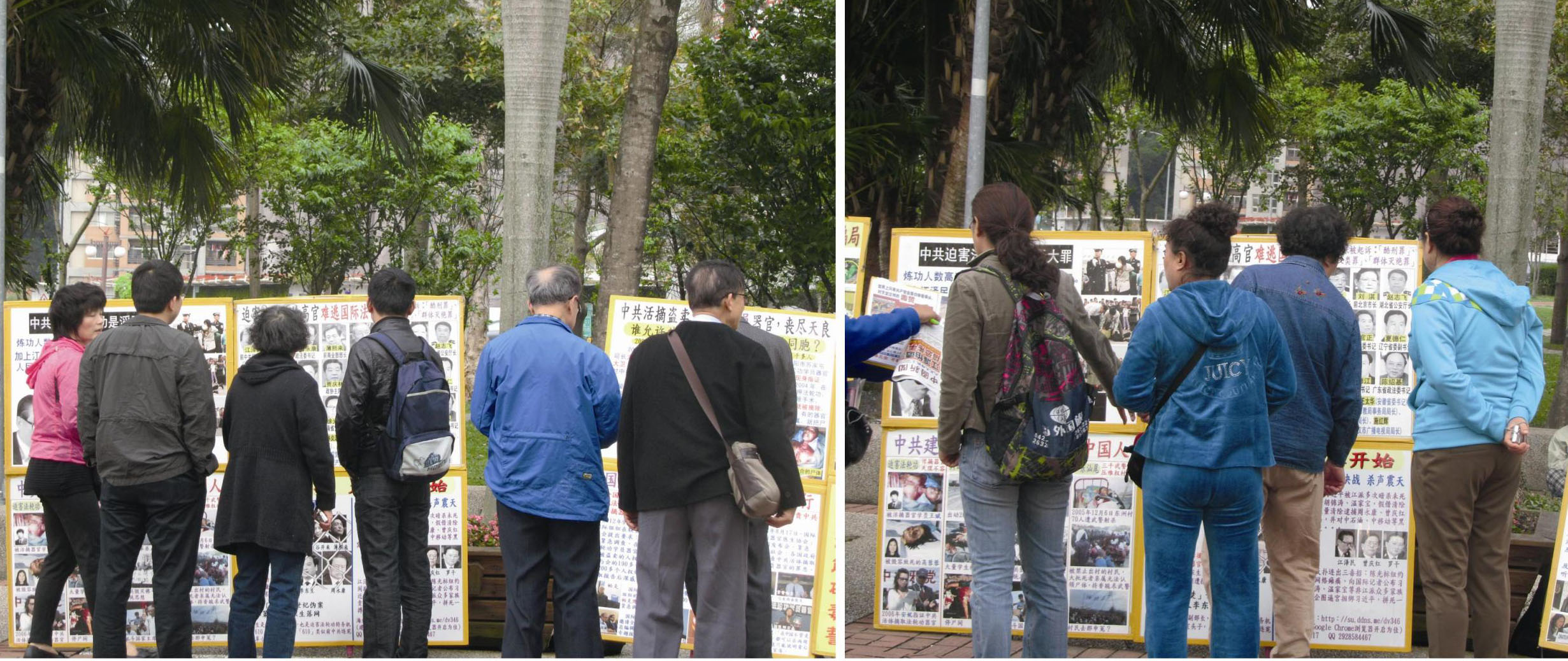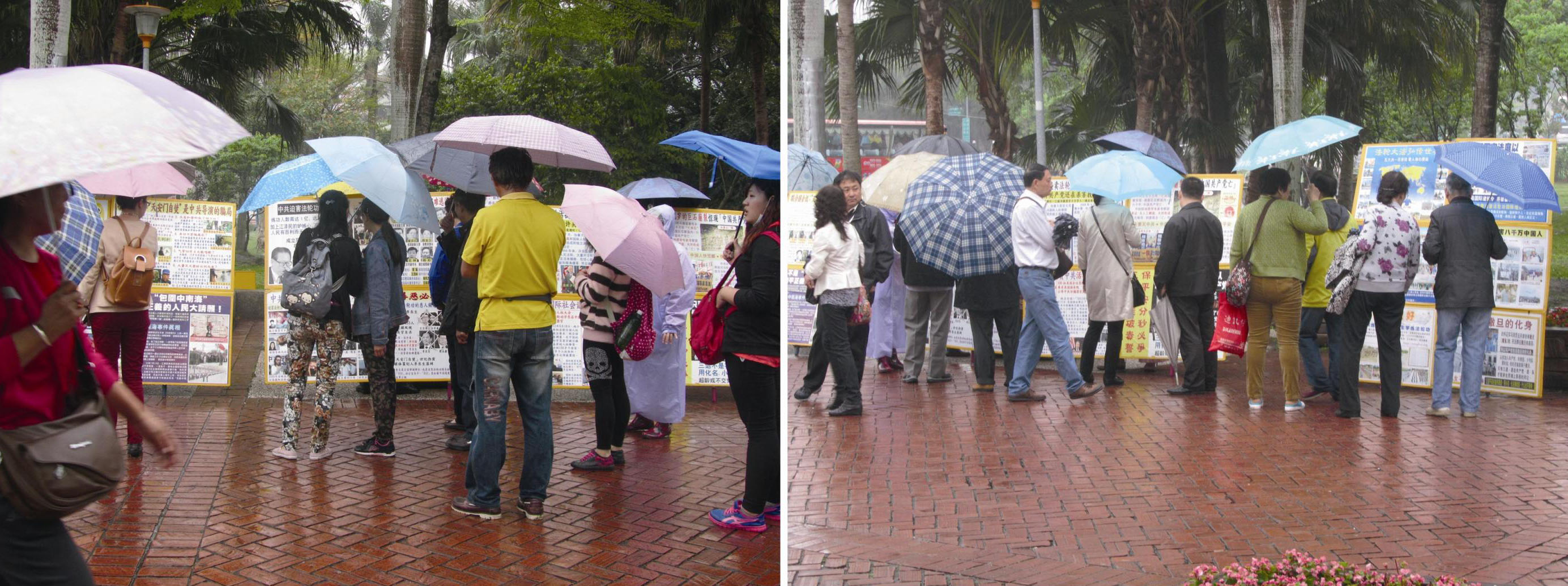 四月初的一个下雨天,一位穿着体面的男士在展板和学员前后转悠。台北学员华美劝他:“先生,展板上登载的这些真相,中共政权极尽手段封锁,你们在国内是看不到的,有缘份出国到海外来,可要把握机会多听多看多了解,明白真相,对你们有好处。”