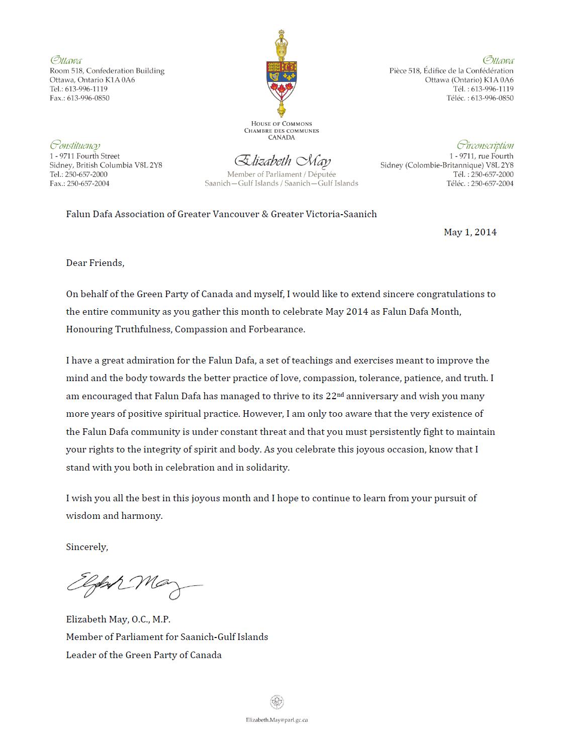 谨代表加拿大绿党和我本人,在庆祝五月的法轮大法月,颂扬真、善、忍之际,向整个社区表达我最诚挚的祝福。