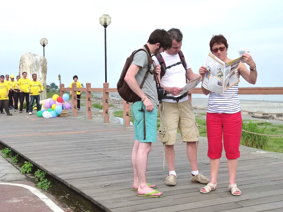 周日下午的海滨公园,一扫连日的阴雨,气候舒爽宜人,许多游客和乡亲扶老携幼在海边散步,看到法轮功集体炼功的美好场面,都露出欣喜的笑容。有人竖起大拇指,有的游客拿着真相资料就立刻详细阅读,也有许多外地游客说:“我们那儿也有很多炼法轮功的,我知道法轮功很好。”