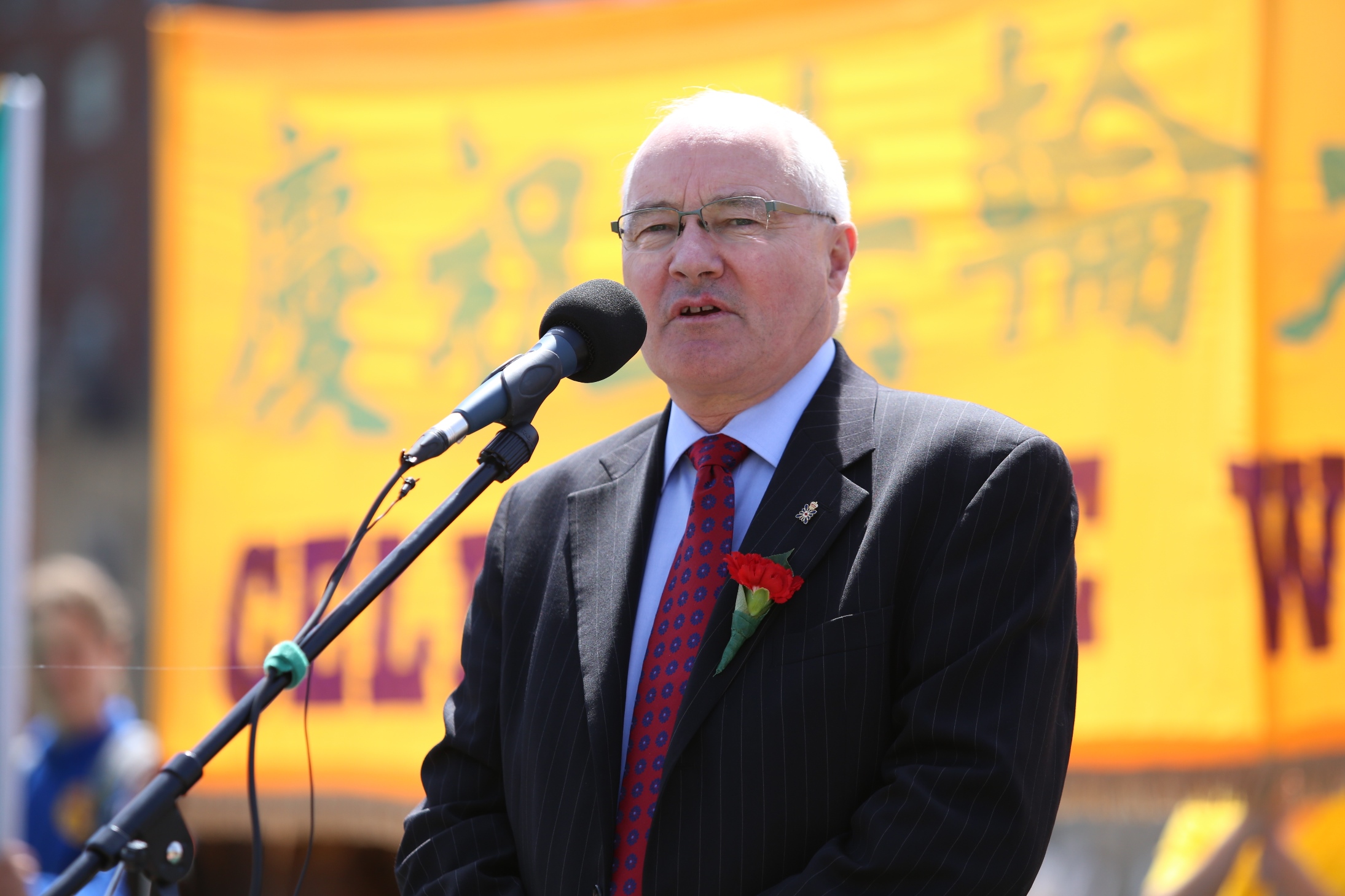 康尼部长在集会上用中文对来宾们说:“你们好!法轮大法好!法轮大法好!”
