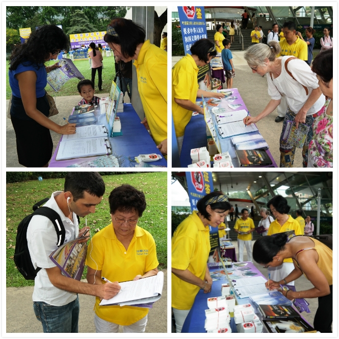 当天途经公园的行人如织,各国游客及新加坡民众纷纷主动了解真相,很多人在“制止中共活摘法轮功学员器官”的征签表格上签名。