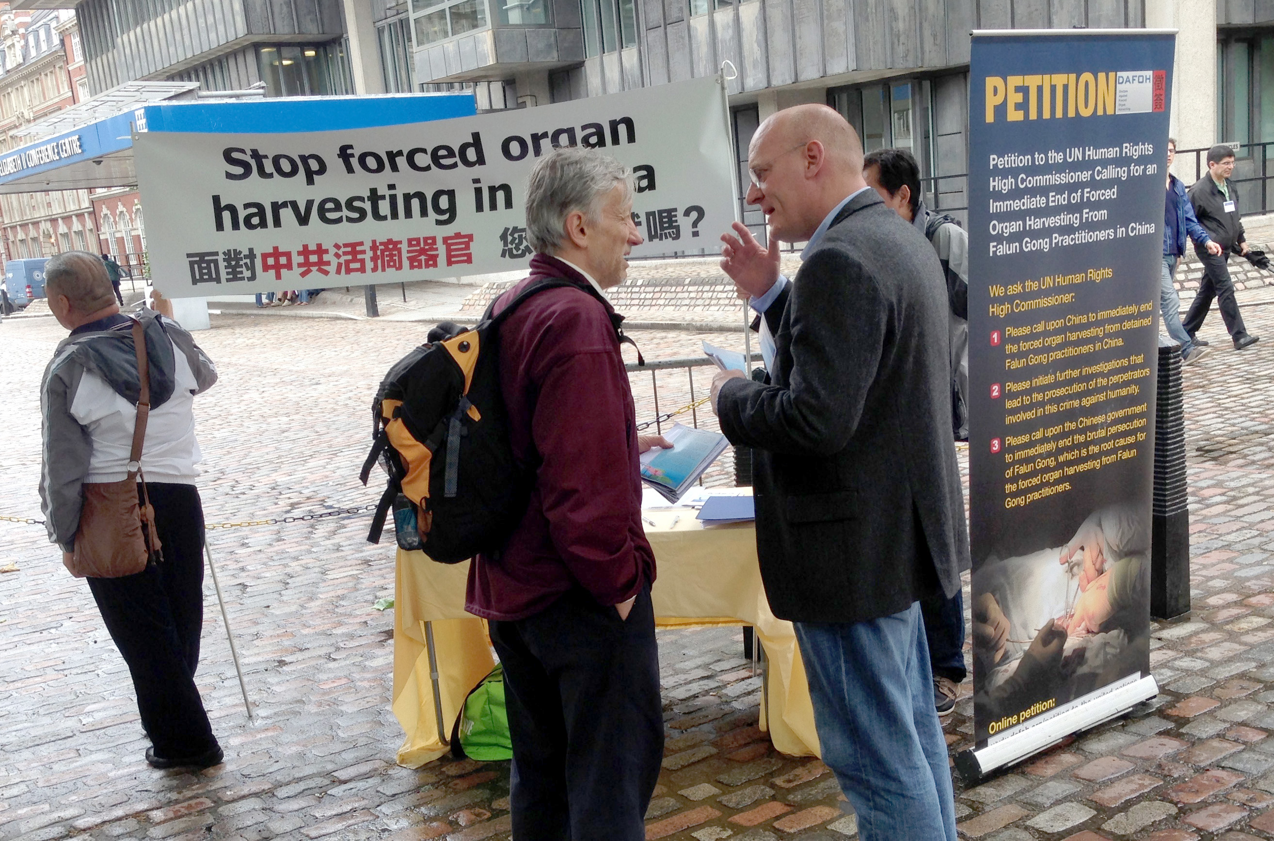 在为期四天的会议过程中,法轮功学员在会场外向与会代表揭露中共活摘法轮功学员器官的反人类罪行。来自世界各地的代表纷纷签名反活摘,他们不但谴责中共大规模活摘法轮功学员器官的反人类罪行,也对在这一罪行背景下在中国发生的不道德的器官移植表示非常关注。