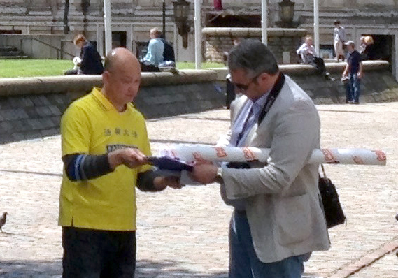 ![]() 图3:六月七日,德国汉诺威某医学院的移植专家尼古拉斯•里克特(右)(Nicolus Richter)在国际移植大会结束前向正在会场外开展讲真相活动的法轮功学员深入交流 |