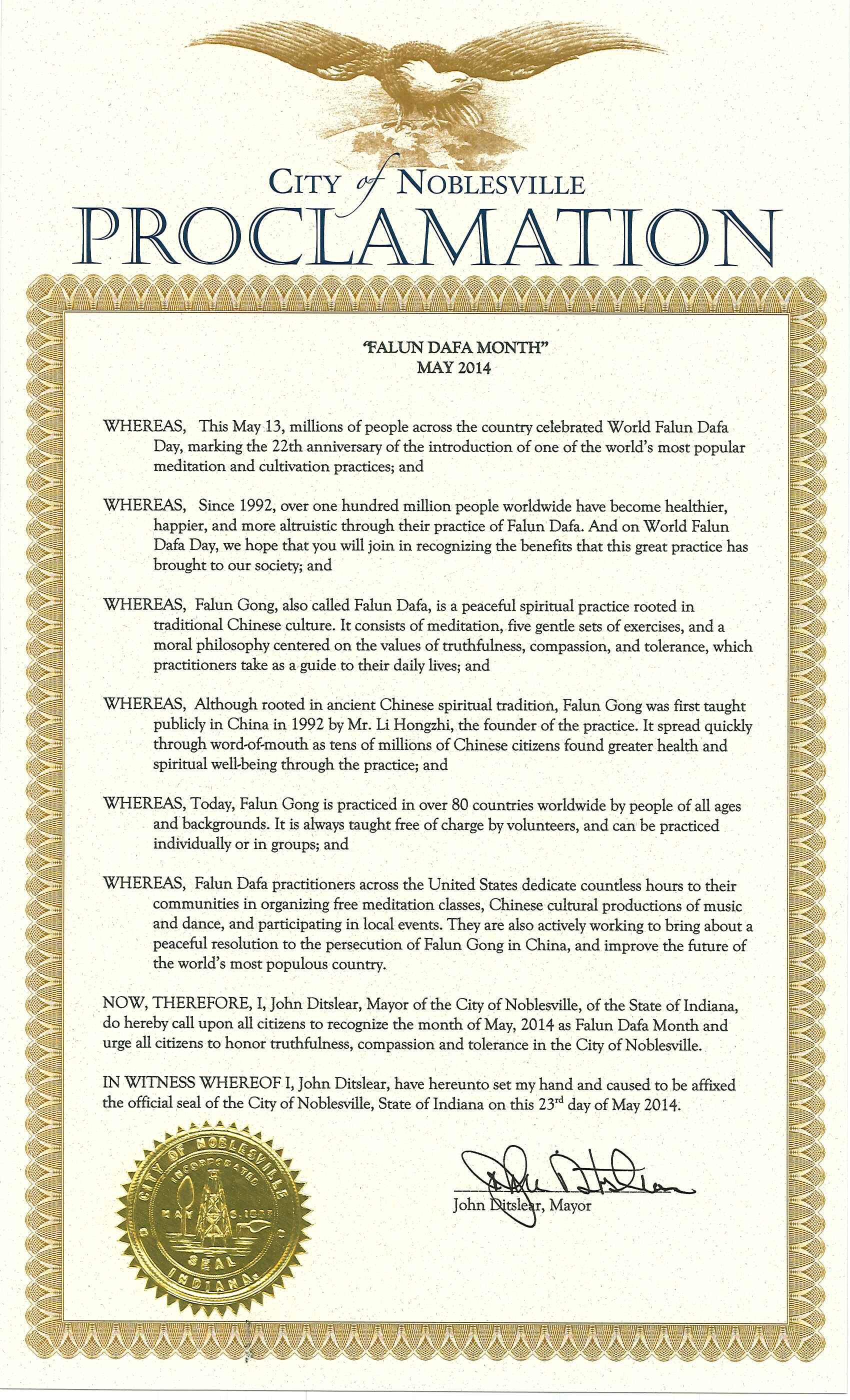 鉴此,我,美国印第安纳州诺贝斯威尔市市长约翰•迪斯理尔,特此宣告二零一四年五月为“法轮大法月”,并呼吁所有市民颂扬真、善、忍。