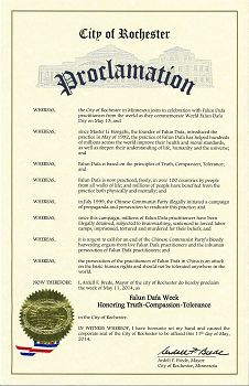 <英文版: http://en.d2s3ombhnov3zf.cloudfront.net/html/articles/2014/6/16/1666.html>明尼苏达州罗切斯特市褒奖世界法轮大法日