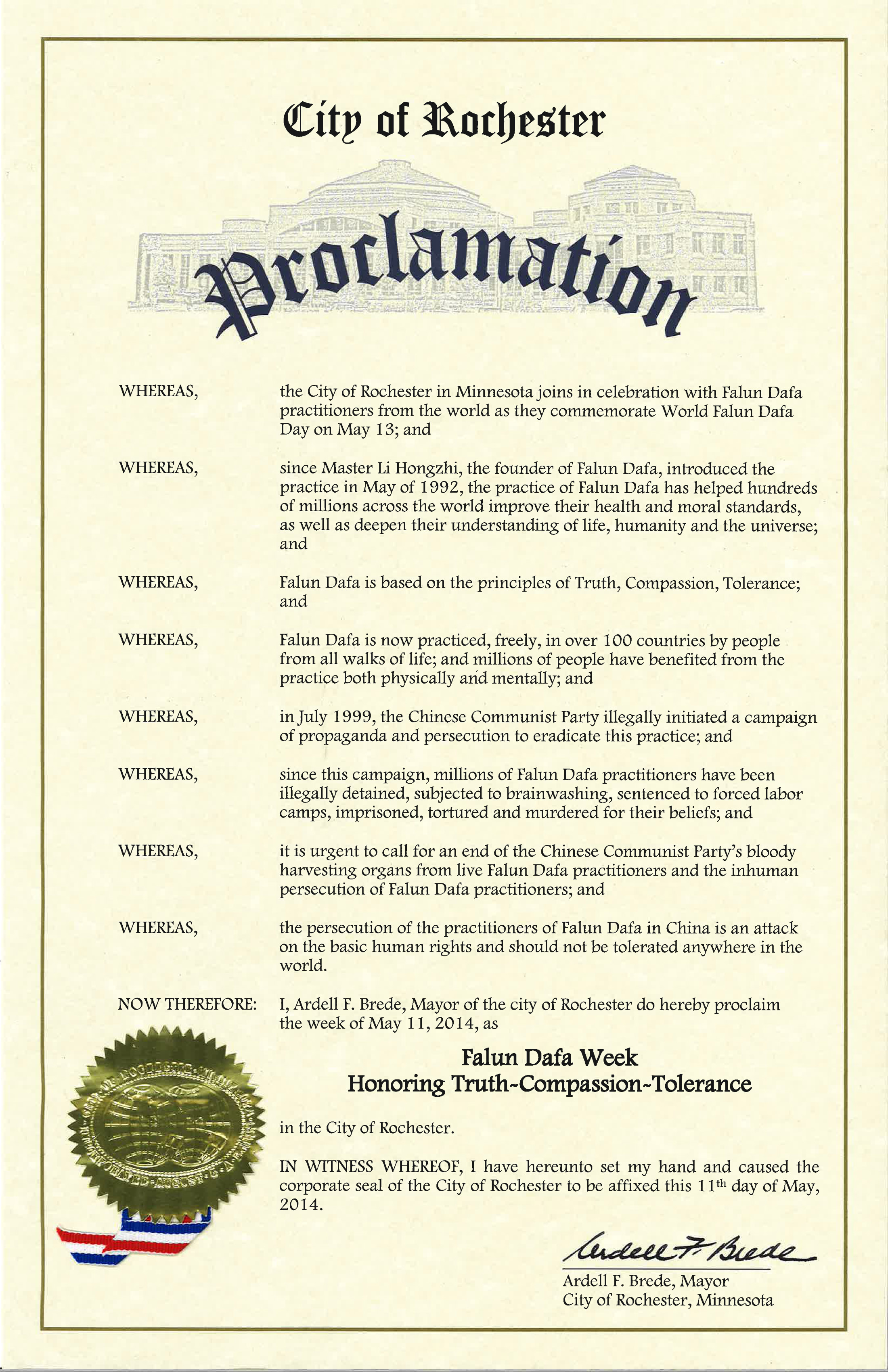 因此,现在,我,阿戴尔•布雷迪,罗切斯特市市长,为褒奖“真善忍”,宣布二零一四年五月十一日这一周,为罗切斯特市市的法轮大法周。