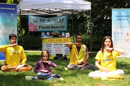 在校方免费提供的活动场地上,法轮功学员们搭建了展台。高高悬挂的“法轮大法好”彩色横幅和展台两侧竖立的法轮功简介条幅,在初夏阳光的照耀下格外醒目。学员们在悠扬悦耳的炼功音乐伴随下,向人们展示了法轮功优美祥和的五套功法,并大量散发了真相材料。