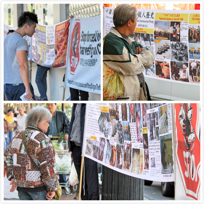 伊士活地区是最多华人聚居地和周末购物最热闹的地区之一。当日正午正是华人购物最繁忙时段,熙熙攘攘的人流不断穿梭于法轮功学员手举的横幅之间,好多来往华人走过横幅都站下来看。其中有一个三十多岁带着两个孩子的女士,在一条横幅前走过时说:“我绝对没看见过这些图片,我也不知道法轮功能被迫害成这个样子。我知道中共很不好,但我不知它这么不好。”然后她每个图片都照相,她说:“我回去必须得好好看。”然后孩子在一旁问:“妈妈,您在干啥?”她对孩子说:“这些都是不能相信的事实,但是这些都是事实,妈妈简直不能相信。”