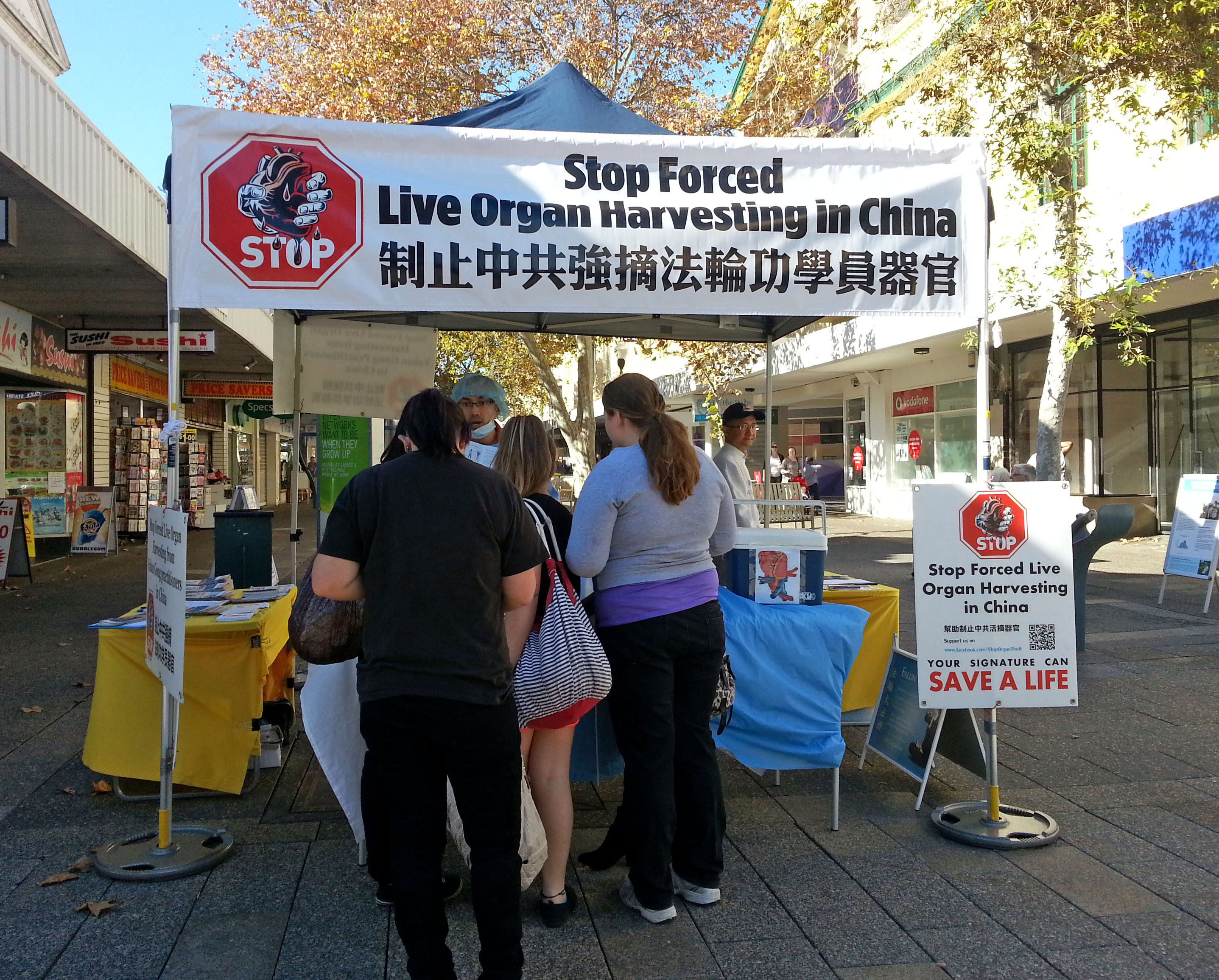 三位十来岁的少年,拿着冲浪板路过真相摊位,看到法轮功学员演示活摘器官场景,开始很不以为然,指着活摘器官手术台上的人体模型,带着嘲笑的口吻问道:“他为什么死了?”一名西人法轮功学员走到他们身边,耐心地跟他们解释了中国许许多多的法轮功学员被活体摘取人体器官,只是因为他们修炼“真、善、忍”做好人,并仔细向他们解释了法轮功教人如何修心向善。几位少年听完后都主动要了传单和活摘器官的资料,然后就离开了。过了好一会儿,三人又回来了,并且带来了一个看上去比他们年龄稍大一些的哥哥,四个人神情看上去都很严肃,他们来到真相摊位,郑重地在征签表上写下了自己的签名和联系信息。