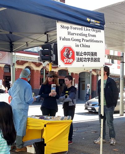 Jenny女士几年前住在西澳的一个乡村,当时向一名学员学炼了功法,后来因为搬家而失去了学炼功法的环境就没有再学。今天见到这个讲真相的摊位,非常激动,马上就问学员要了炼功点的地址和联系电话,希望能马上重新开始学法炼功。