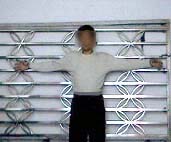 ![]() 酷刑演示:将双手铐在铁栅栏门上喂蚊子 |