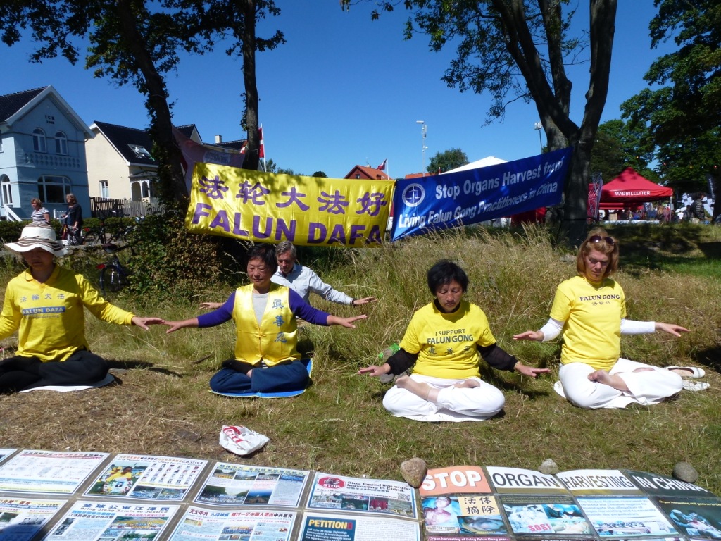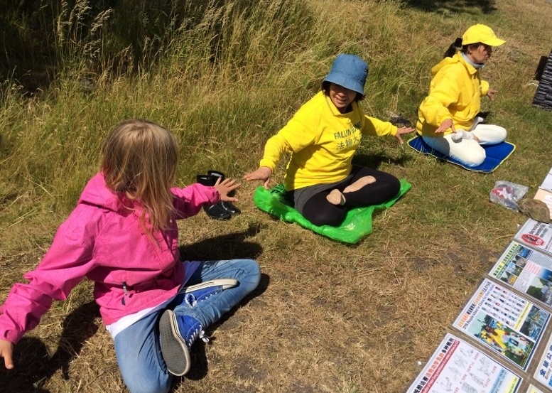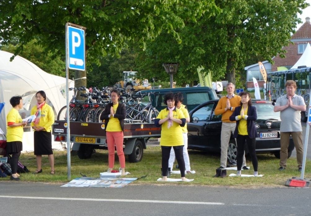 悠扬的炼功音乐在博恩霍尔姆岛上空回响,面带祥和笑容的法轮功学员展示着舒展优美的炼功动作,吸引着川流不息的人群驻足观看,不少人表示想学炼功法。一名穿粉红外套小女孩一边看一边模仿学员的炼功动作,后来干脆在学员身边坐下来,并一下就能双盘了。