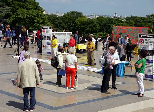 ![]() 图1-5:巴黎学员在著名景点埃菲尔铁塔下的人权广场传播法轮功真相,吸引四方来客驻足了解。 |