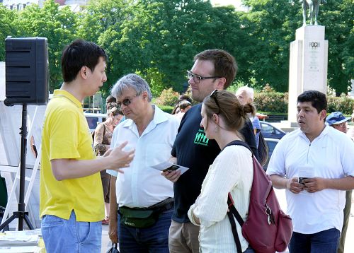 人权广场上人流熙熙攘攘,看到法轮功学员安静祥和的炼功动作,很多人表示想学炼法轮功。有的人询问炼功点地址,有的人要上网查看更多的信息。三个原籍土耳其的高中生在一旁观看法轮功学员炼功,等到炼完五套功法,他们坚持要和法轮功学员合影留念,在法轮大法的横幅下留影后,又在“制止中共活摘法轮功学员的器官”征签表上签了名,他们才高兴地离去。