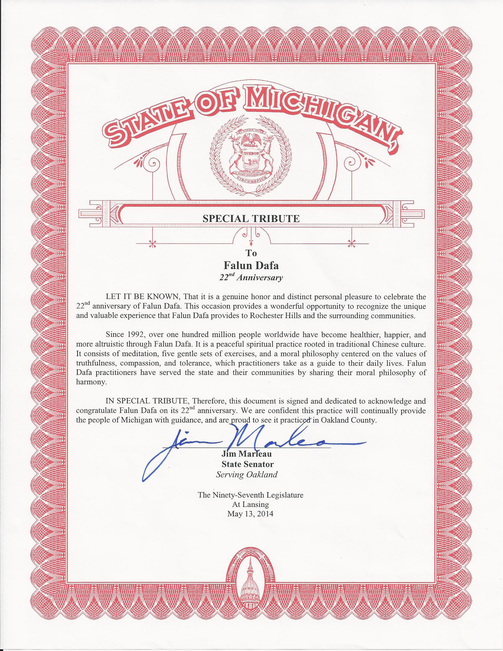 作为特殊的奖励,因此签署本文件,并致力于承认并祝贺法轮大法弘传二十二周年,我们有理由相信,这种功法将继续带给密西根州人提供指导,并自豪地看到功法在奥克兰县(Oakland County)弘传。