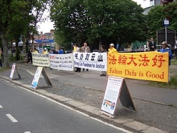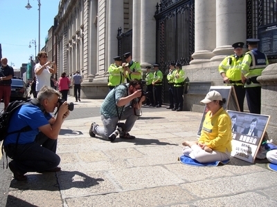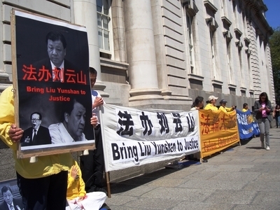 六月十七日中午,刘云山一行前往爱尔兰总理府拜见总理肯尼。在进入总理府时,迎接刘的依然是响亮的“法办刘云山”等口号。法轮功学员在酷日下的静坐抗议不仅吸引了过往行人,也引来媒体的关注。