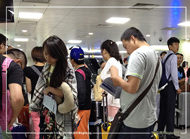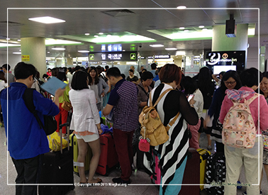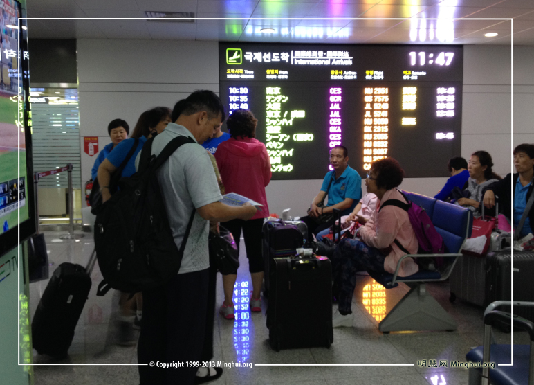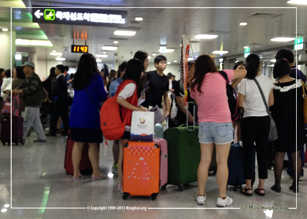 记者在济州机场观察到,游客中从青年学生到官员和生意人士都很多,导游们年龄普遍年轻,拿着小旗,操着流利的双语,熟练的招呼旅游团成员和办理手续。记者还见到三位正在发报纸的法轮功学员。据他们介绍,济州岛的中国游客相当多。每天有15至22个航班从中国大陆直达济州机场,还不包括其它地方转机到济州机场的,以及从济州机场出境回中国的。每个月另有40艘豪华游轮来济州,带来更多中国游客。