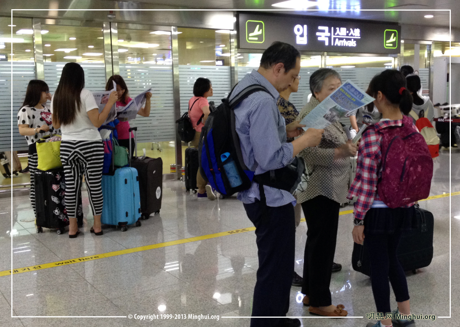 三位法轮功学员发放的是法轮功真相报纸。好象被一根无形的缘线牵着,很多游客刚出海关就接到报纸,在等待导游安排搭乘巴士的短暂时间内就开始翻看,有的还看得非常专注。