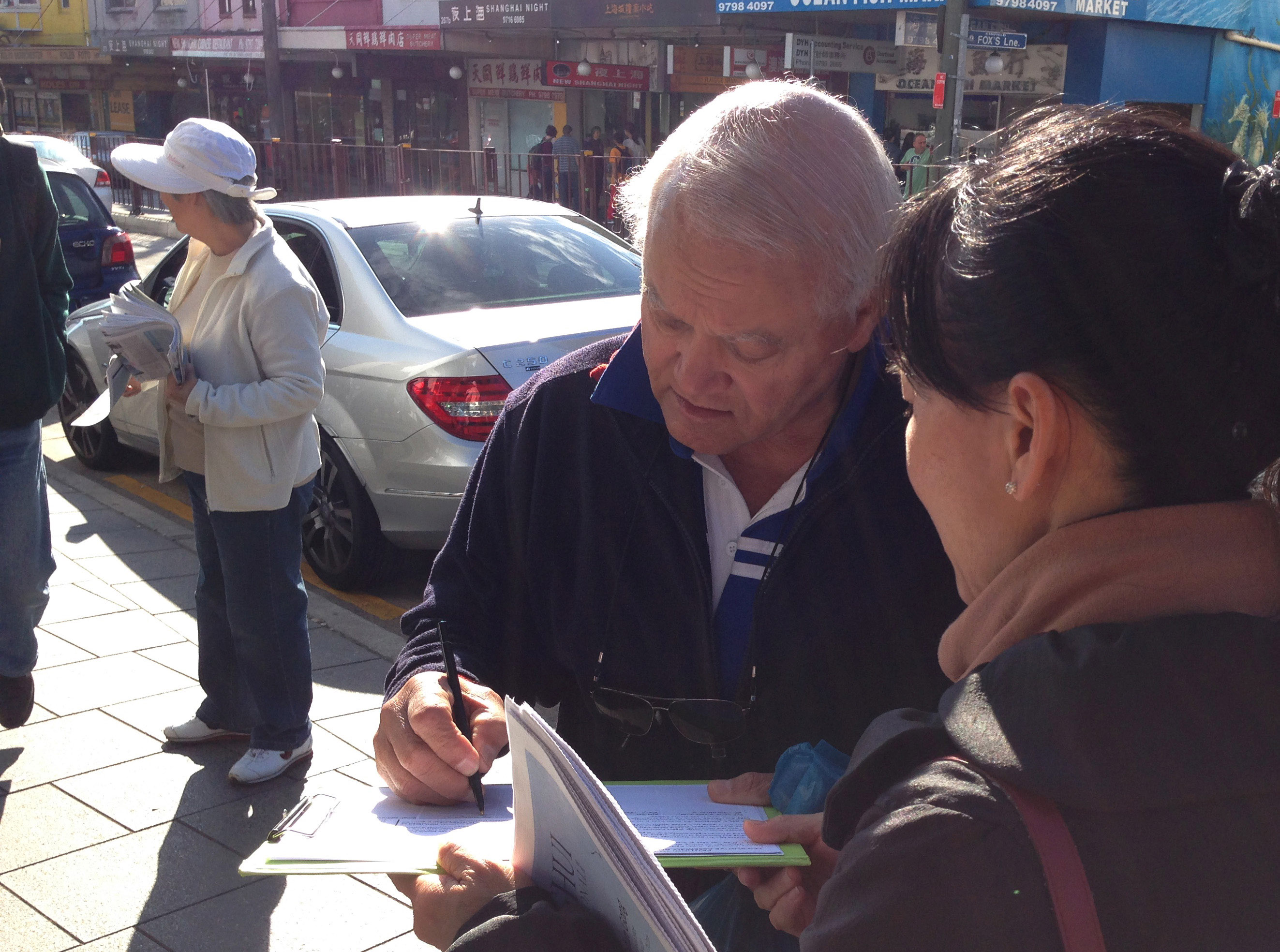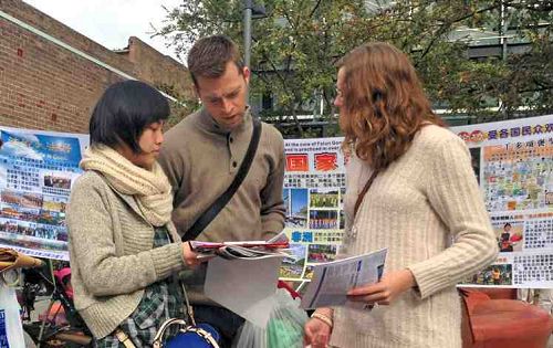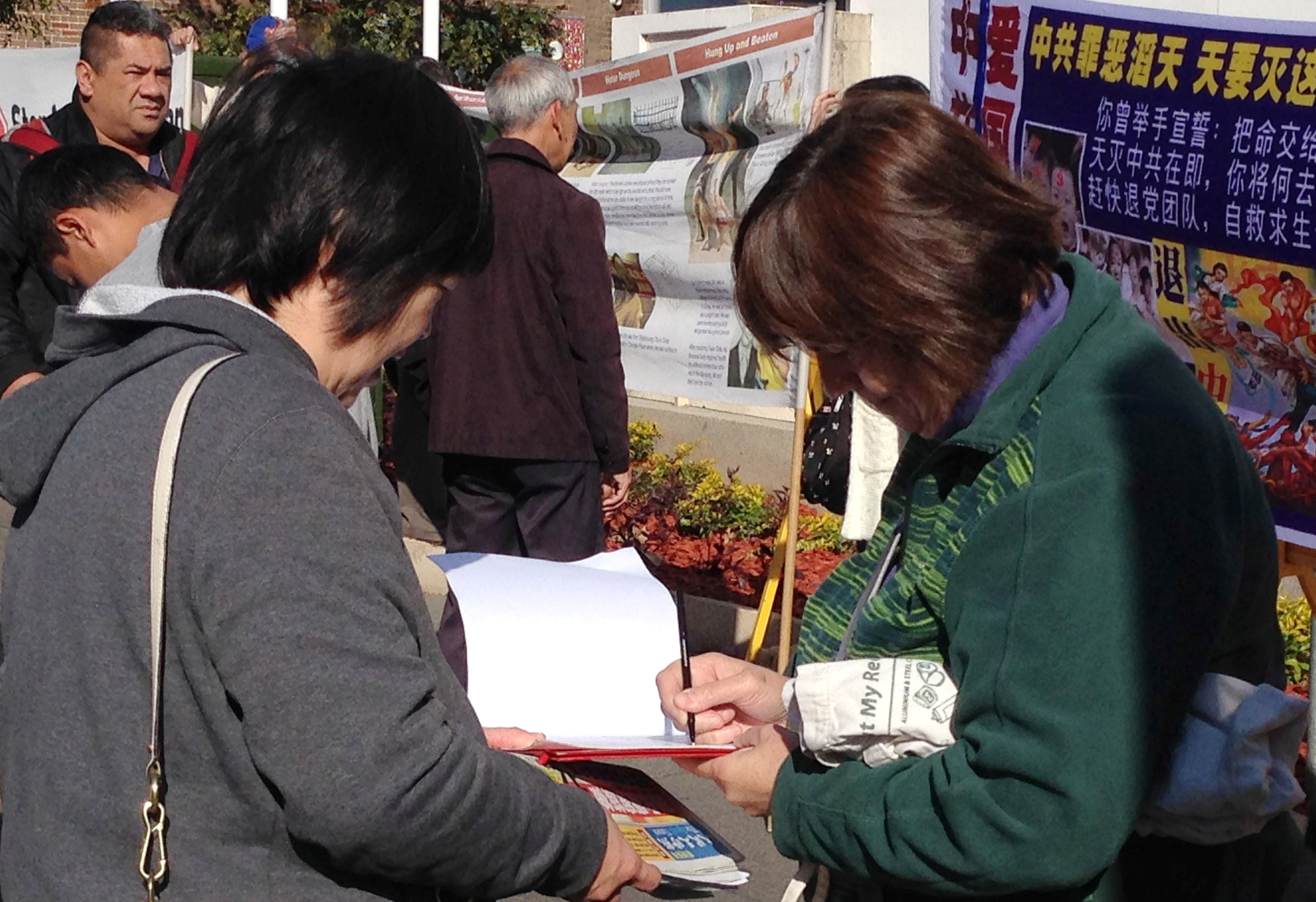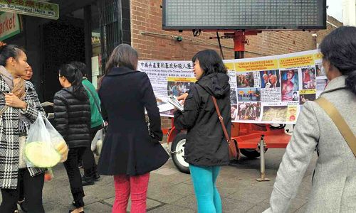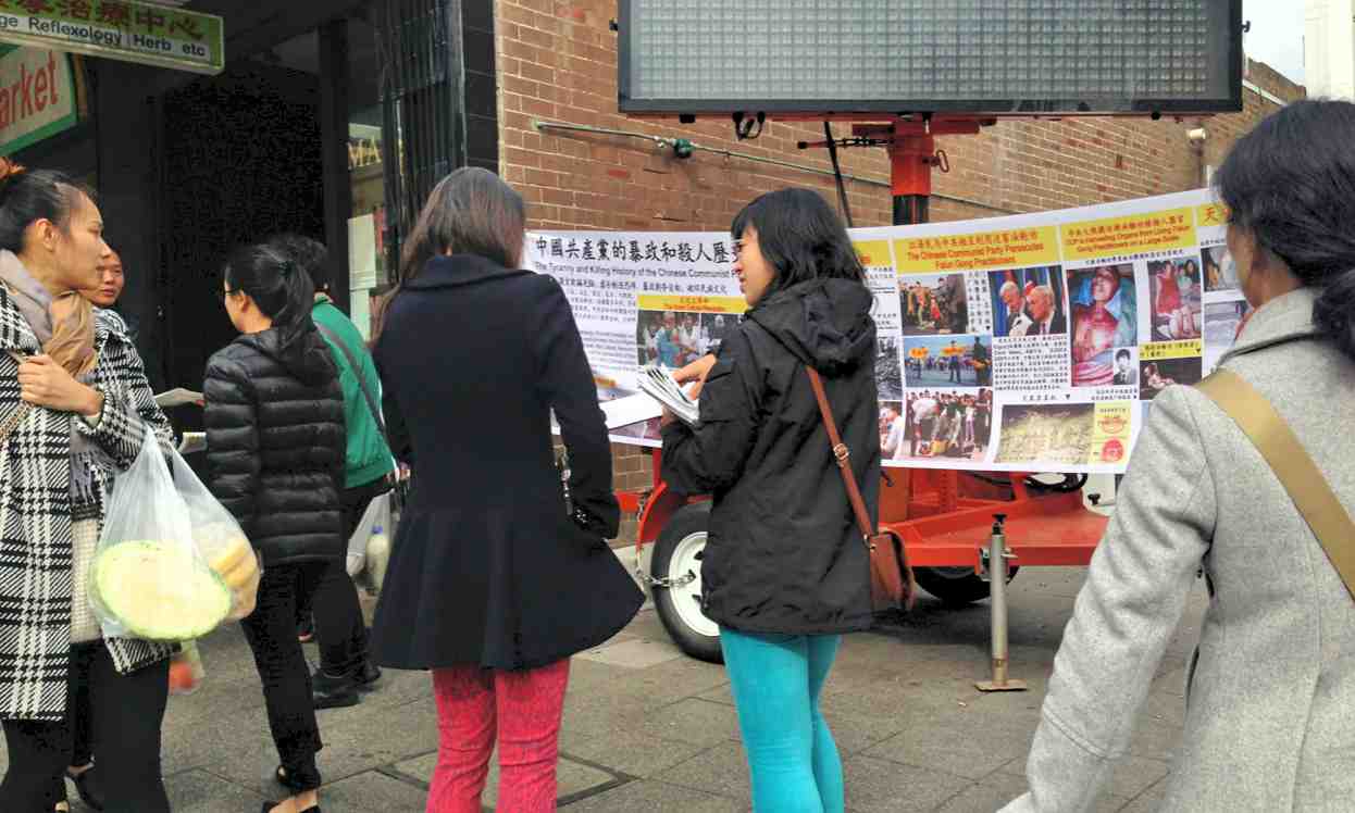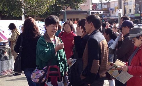 还有一位刚从北京来澳看望子女的女士,主动找到义工询问这是什么活动。义工告诉她,我们是法轮功学员,在揭露中共邪*党-活摘法轮功学员器官的真相。这位女士小声告诉义工,在北京的法轮功学员是会被抓捕和遭到迫害的。义工进一步向她讲述了迫害真相后,她很高兴地同意“ 三:退.”,在询问了如何学炼法轮功功法。得到回答后,她高兴地离开。