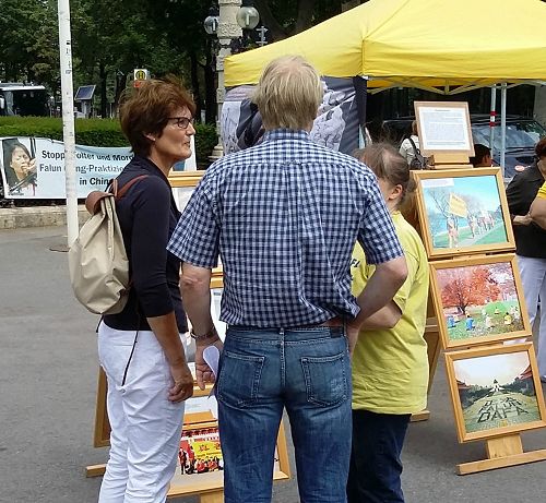 ![]() 图1-2:维也纳玛利亚特蕾西亚广场上,人们驻足了解法轮功真相 |