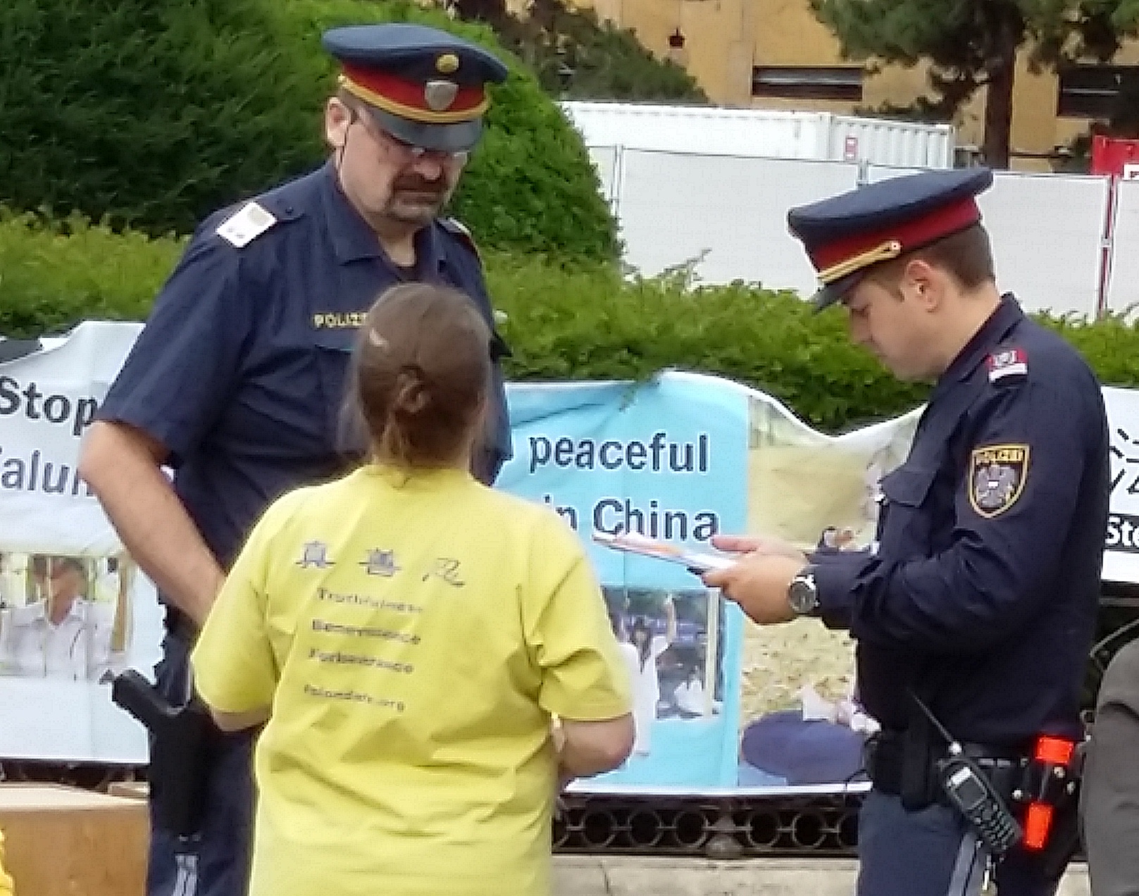 ![]() 图3:玛利亚特蕾西亚广场上,维也纳警察也来了解法轮功真相 |