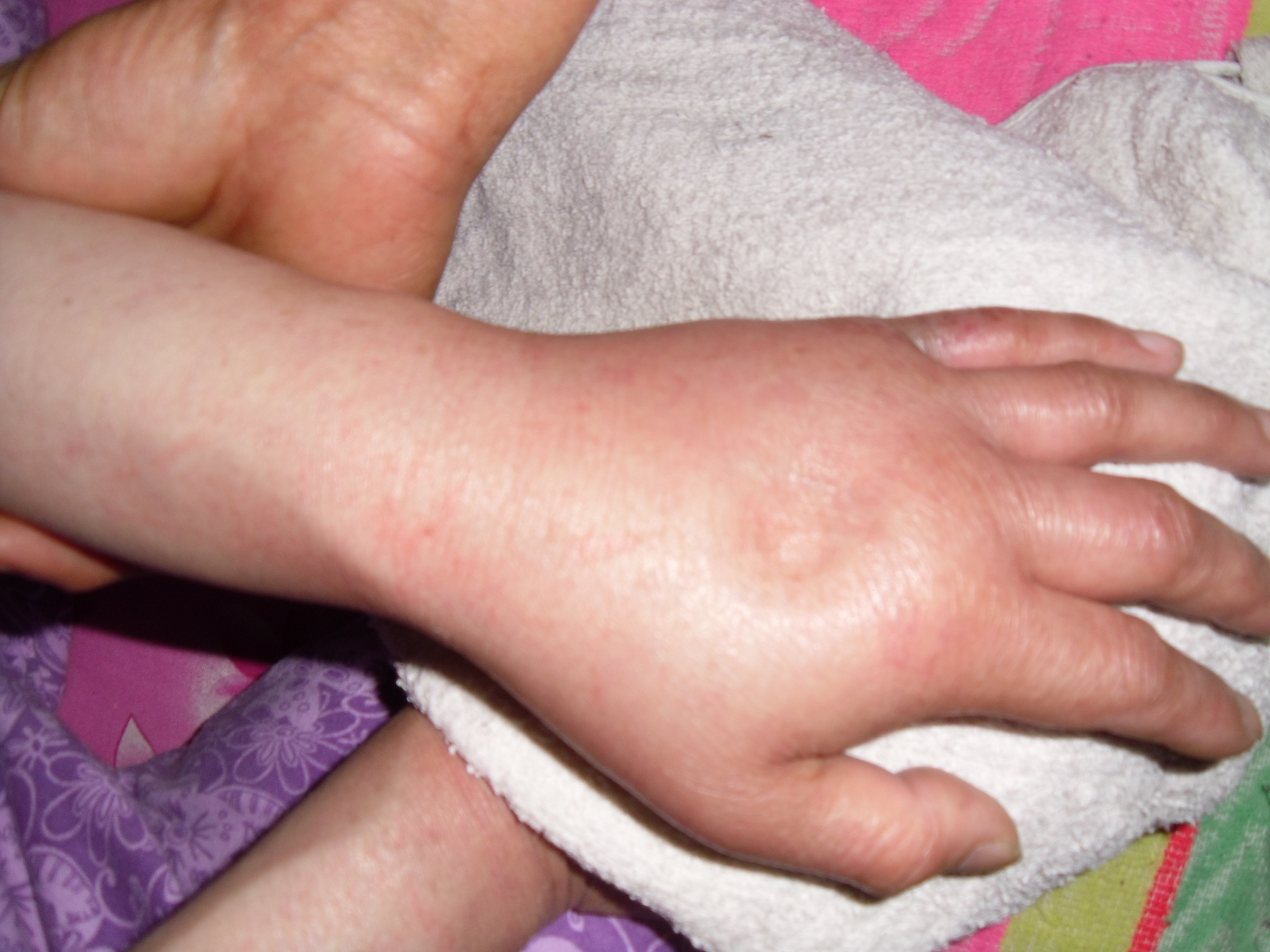 后来,里玉书身体几秒钟就不自觉地摇动、颤抖,半边身子不会动,嘴、肩膀歪斜,嘴角不自觉地流口水,从舌头一直到下巴都发木发麻,不好使,耳朵听不太清楚,眼睛也看不太清楚东西,身体浮肿,得两个人抱着穿衣服、脱衣服,抱着上床。