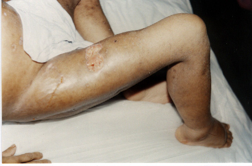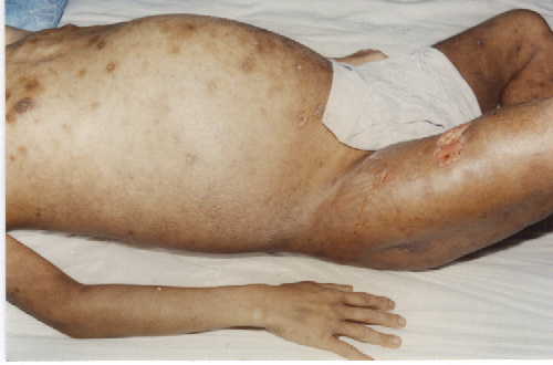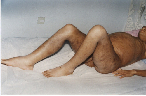 ![]() 肖劲松被迫害得骨瘦如柴,腹部、大腿根部肿大。 |