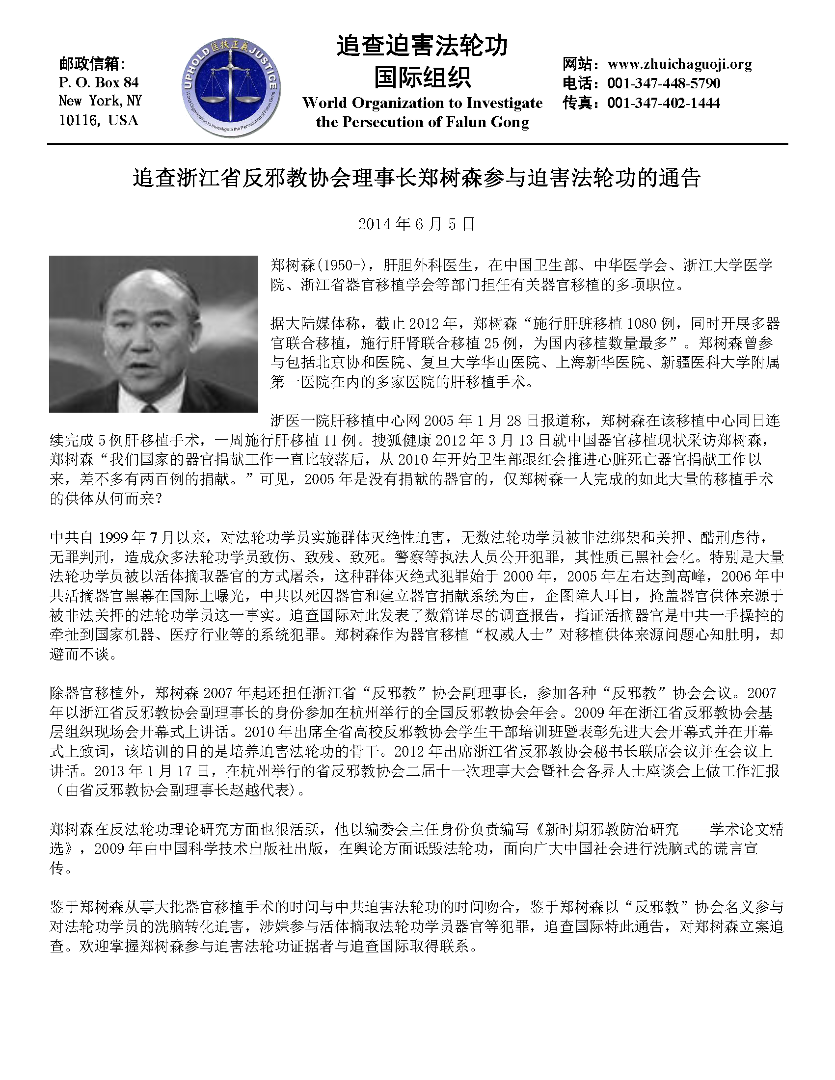 “追查浙江省反邪教协会理事长郑树森参与迫害法轮功的通告”是由追.查!国际(追查迫害法轮功国际组织)发出的对郑树森立案追查的通告,通告上附有郑本人的头像。通告中说:
