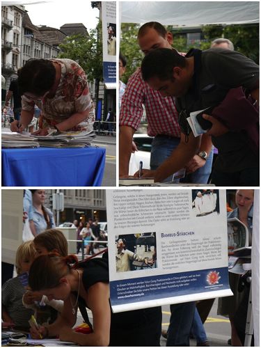 ![]() 图1-2:苏黎世民众震惊于中共活摘法轮功学员器官的暴行,纷纷签名制止迫害。 |