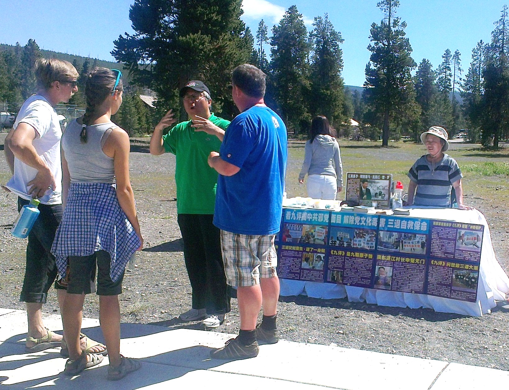 在黄石公园游客村的傍晚,人们纷纷走上街头纳凉,其中不乏从中国来的游人。这些中国游客们惊奇地发现,在村镇最热闹的十字街头也能看到法轮功学员的身影。看到他们递来的《大.纪.元;特刊》和《明慧周报》,其中很多游客笑着说自己已经读到过了;有些游客开始不接,后来听说这份报纸包含着最新时事,回头欣然接受;也有些游客仍有偏见,不愿接受。